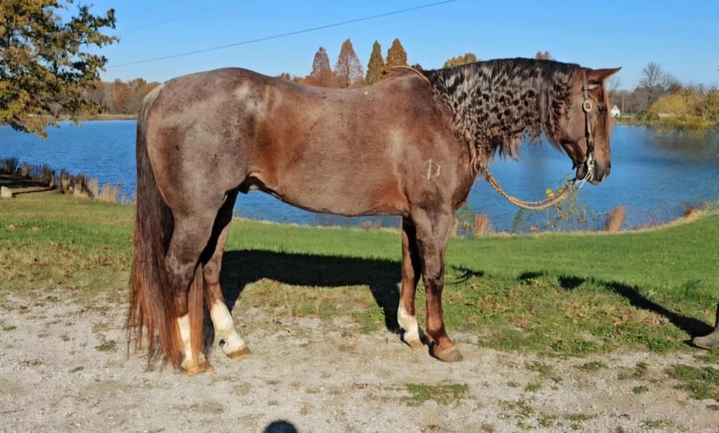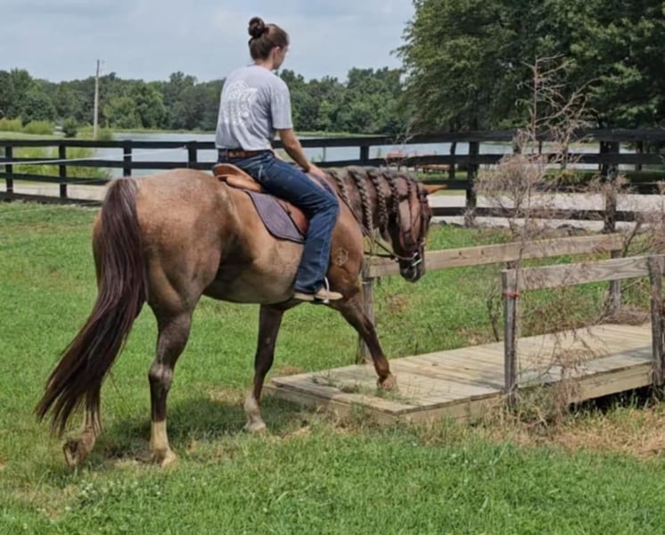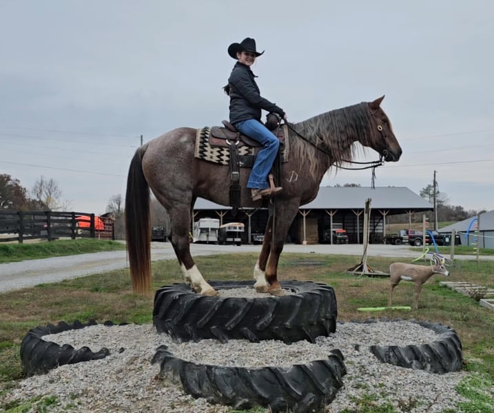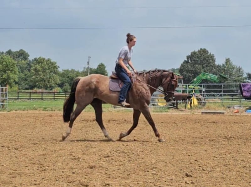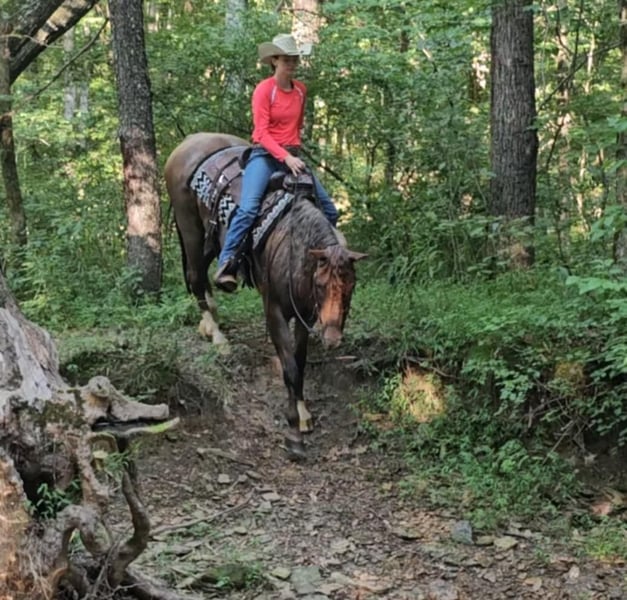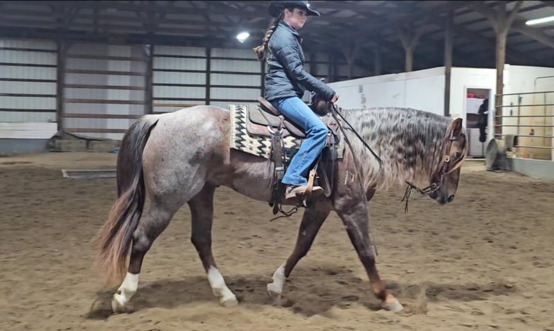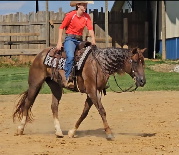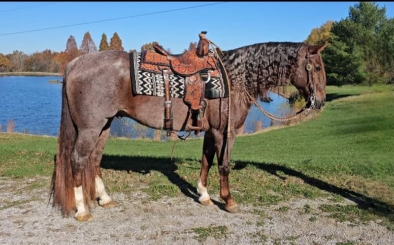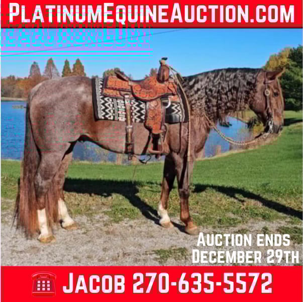 ONLINE AUCTION Place your bids at www.PlatinumEquineAuction.com Starting Bid $3500 Auction ends December 29th, 2024 Need a new saddle? Check out White Rock Saddles on our website or Facebook! DDD Busy Blazin Batt is a 10 year old AQHA RED ROAN Gelding. He stands 15 hh and around 1100lbs. Here is one of the coolest looking geldings with a long beautiful thick main & tail. Bart has been extensively trail ridden/overnight camped & worked in the stocked yards for the last 6 years. He is a very confident trail horse that has seen it all out on the trails. This gelding will cross water, logs, ditches, etc, without hesitation. He has a great one hand neckrein, gives to the bit laterally and vertically. We have put him through our desensitizing. We have even rode him english & he looks beautiful doing it! This gelding walks, trots, canters collected, & side passes. He works off your seat and leg well. He is a horse that will look SHARP in the ranch arena. This gelding has a natural low and flashy headset. Bart has a to die for extended trot! If you’re looking for a trail horse that has already seen the sights and is ready to go see them again or go on with in the arena, here he is! You won’t find another one like him! He stands all day tied, is great for clipping, bathes, the farrier, loads, & unloads out of the trailer perfectly. Call for more information call Littlepage Livestock Jacob 270-635-5572 Located in Robards, KY. ONLINE AUCTION Place your bids at www.PlatinumEquineAuction.com Starting Bid $3500 Auction ends December 29th, 2024 Need a new saddle? Check out White Rock Saddles on our website or Facebook!