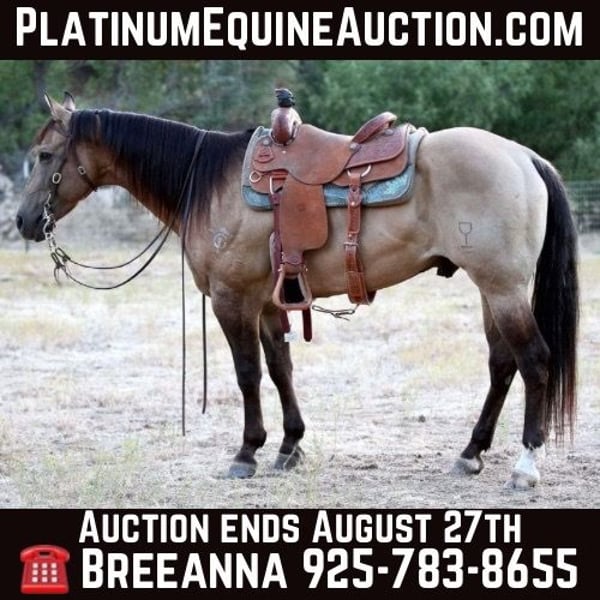 ONLINE AUCTION Place your bids at www.PlatinumEquineAuction.com Starting Bid $3500 Auction ends August 25th, 2024 Need a new saddle? Check out White Rock Saddles on our website or Facebook! If you’re seeking a magnificent and reliable mount for your family, A1 is an exceptional choice. With a thick, dark dorsal stripe, shiny coat, and gentle eyes, he exudes elegance and strength. I fully endorse this gelding and his ability to excel in various riding disciplines. His calm and gentle nature makes him an excellent mount for riders of all experience levels. A1 is a grade horse, aged 10, standing at about 15.1 hands I will tape to confirm and is shod all the way around. He has been extensively trail-ridden, tackling challenging obstacles such as tarps, bridges, logs, flags, water, dogs, and other horses with ease. He performs equally well in the arena, displaying smooth gaits and responding well to rider cues. A1 is incredibly versatile, allowing riders to choose their preferred method of communication, whether it be through a bridle or simply a string around his neck. He stops, turns, and rolls back with precision and ease. With a slight toe-out in the front, he poses no issues and is ready to be part of your family’s riding adventures. His quiet and patient demeanor during travel and while waiting for his rider is a testament to his excellent temperament. I struggle to find any flaws in this extraordinary horse, making him an incredibly rare and valuable addition to any family or stable. Please feel free to contact me. Cross b horses Breeanna 925-783-8655 located in Valley Springs, CA. ONLINE AUCTION Place your bids at www.PlatinumEquineAuction.com Starting Bid $3500 Auction ends August 25th, 2024 Need a new saddle? Check out White Rock Saddles on our website or Facebook!