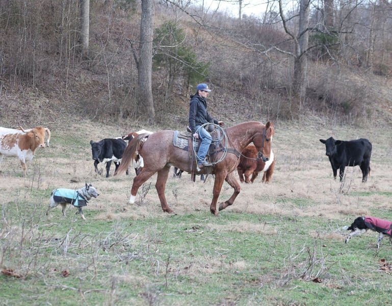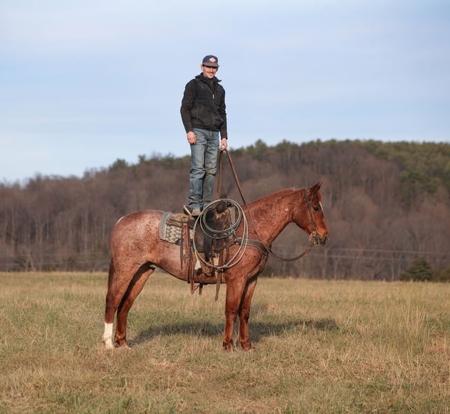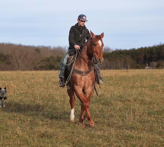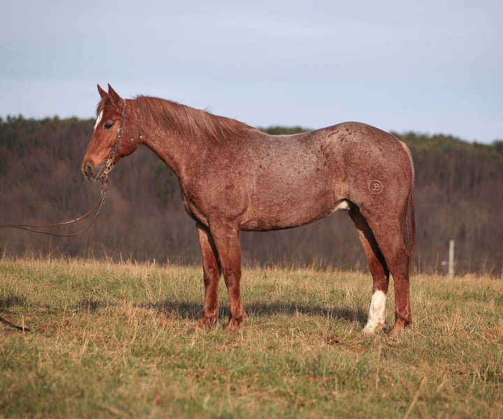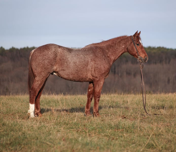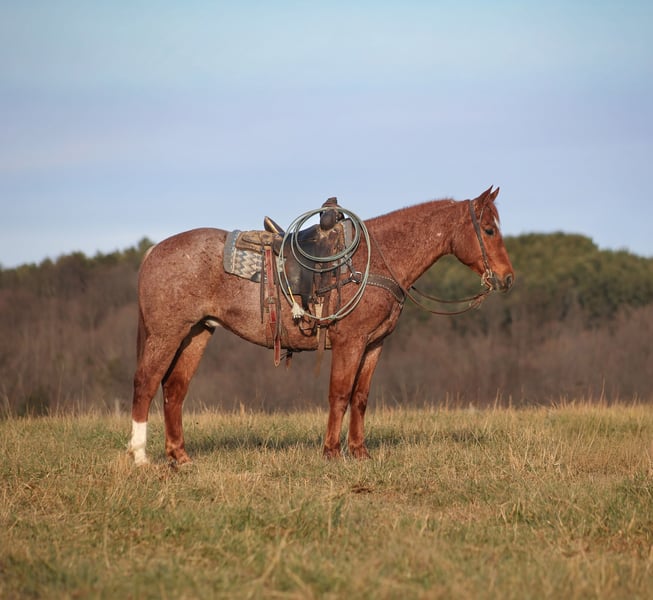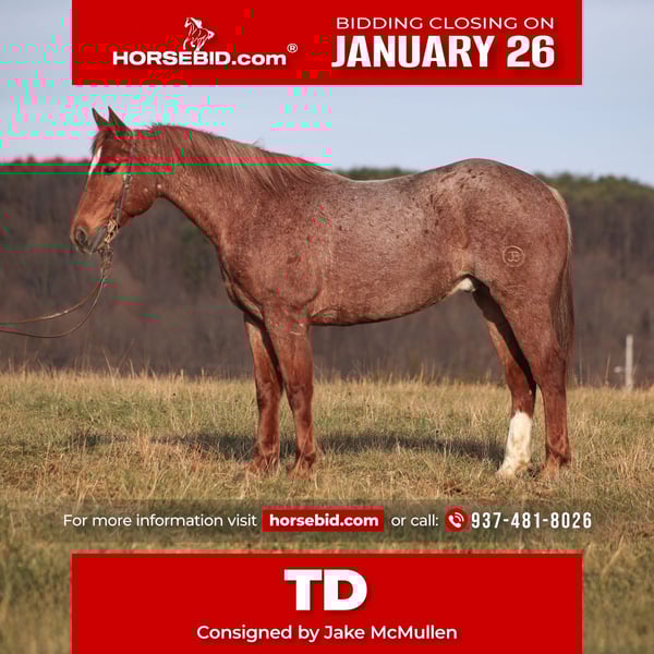 𝐉𝐀𝐍𝐔𝐀𝐑𝐘 ⭐️𝑨𝒍𝒍 𝑺𝒕𝒂𝒓 𝑳𝒊𝒏𝒆𝒖𝒑⭐️ Happening now thru MONDAY | JANUARY 26th - Available EXCLUSIVELY on HorseBid's website! For more details and to register visit: www.Horsebid.com CONSIGNOR CONTACT: Jake McMullen 937-481-8026 LOCATION: Berea, KY BREED: AQHA REGISTERED: Yes REGISTERED NAME: TDL Gumbo Hancock COLOR: Red Roan HEIGHT: 15.2 AGE: 12 GENDER: Gelding TD is a beautiful red roan gelding that is standing 15.2h+ tall. He registered in the AQHA, is a 2014 model and will weigh over 1300lbs. TD is super friendly and easy to handle! He is a horse for all jobs, anything on the ranch from sorting to pasture roping, to trails up in the rugged mountains... he will do it all! TD was born and raised in Montana, he has been ridden up in the rugged mountains and hunted off of. TD has spent time working in Texas at a feedlot, riding pens, loading trucks, roping and doctoring sick ones. You can leave him off for a couple months, tack him up, step right on him and he will walk off gentle. He has a smooth jog, takes his leads in a nice slow lope and has a good stop. He reins around and is one hand broke. TD could go English and shows talent at jumping. He has been exposed to all kinds of wildlife and works well with stock dogs. If you want to feel like a trail boss and blaze the trails or if you need to get a job done out on the ranch… TD will work or you! Located in Berea, KY. Shipping available anywhere. For more information call Jake McMullen 937-481-8026
