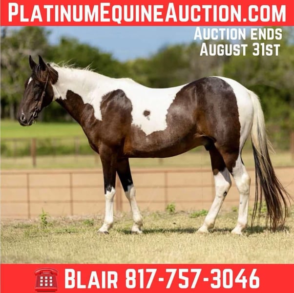 ONLINE AUCTION Place your bids at www.PlatinumEquineAuction.com Starting Bid $3500 Auction ends August 31st, 2025 Need a new saddle? Check out White Rock Saddles on our website or Facebook Brodie is a stunningly GORGEOUS 11 yr old, 15.2H bay roan paint, TW cross gelding with ALL the personality in the world! If you want a super unique one, this guy is for you! Brodie is an absolute character! He’s the trail partner you’ve been looking for! He’s as absolutely comfortable as they come and easy to ride, just point and go! He neck reins or direct reins, moves off leg, goes the speed you ask and stops when you tell him to! He’s not watchy or spooky, he has zero buck, bolt or rear and is truly FUN to ride! Brodie has spent his life as a lady’s trail horse and will go on to make a pleasure rider/trail rider really happy! He has all the looks in the world and is exactly the combo many people search for, looks, personality and he’s SAFE to ride anywhere! Brodie definitely must have been a dog in a previous life, he’s goofy and really tries to let you know exactly what’s on his mind. He’ll be the first one to call you at the stall door/gate and he loves attention! His reaction to affection is just like a big Labrador’s. If you hurt his feelings he will let you know by pouting like a puppy. Brodie leads great, loves being pampered while bathing like a spoiled dog at his weekly grooming appointment, loads and ties good! He’s great for the farrier, current on teeth, feet and coggins and ready for his new partner in crime! Don’t miss your opportunity to own a really unique one! More pics and videos on his website page at northtexashorsecompany.com/brodie. Please call Blair with North Texas Horse Company for more info at 817-757-3046. We are located in Weatherford, TX and can help arrange affordable shipping to anyone!! ONLINE AUCTION Place your bids at www.PlatinumEquineAuction.com Starting Bid $3500 Auction ends August 31st, 2025 Need a new saddle? Check out White Rock Saddles on our website or Facebook