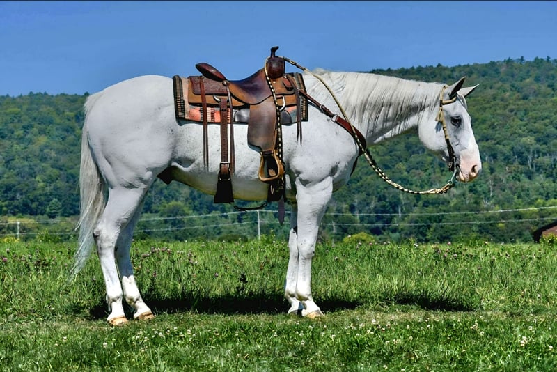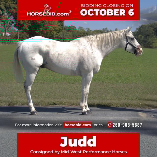 🍂 𝓐𝓾𝓽𝓾𝓶𝓷 𝑨𝑳𝑳 𝑺𝑻𝑨𝑹 𝑳𝑰𝑵𝑬𝑼𝑷 🍂 Happening now thru MONDAY | OCTOBER 6th - Available EXCLUSIVELY on HorseBid's website! For more details and to register visit: www.Horsebid.com CONSIGNOR CONTACT: Mid-West Performance Horses 260-908-5687 LOCATION: Saint Joe, IN BREED: Quarter Horse REGISTERED: No COLOR: Grey HEIGHT: 15.3 AGE: 11 GENDER: Gelding Judd is a 11 year old Quarter Horse gelding. Standing a solid 15.3 hands tall. He has a very upstanding personality and loves everyone. Judd will meet you at the gate and follow you wherever you want to go. He has been ridden by a 15 year old girl and he has done absolutely wonderful. He has no spook or bolt. Judd will stand tied all day to a tie rack or overnight to a tie line. He has been on the trails, open fields, down main highways, and rode through town with no issues. Judd will go through water, cross logs, go up and down the steepest hills, and stand to be bathed. He will take you through the toughest terrian and he enjoys every minute of it. He is very sure footed and watches where he goes to make sure his rider stays safe! Judd rides bareback, western, and english. He will trail ride alone or with a group. He is comfortable and confident leading a group of horses, being in the middle or being in the back of the pack. He always loads and unloads with ease. Judd has been in with cattle, around all sorts of livestock, and is use to dogs. Nothing bothers him! He's safe for everyone. He picks up the correct leads and has a rocking chair lope. This guy could go any direction his rider would want to take him. Judd carries the famous Woody Barlet brand! Come check him out!