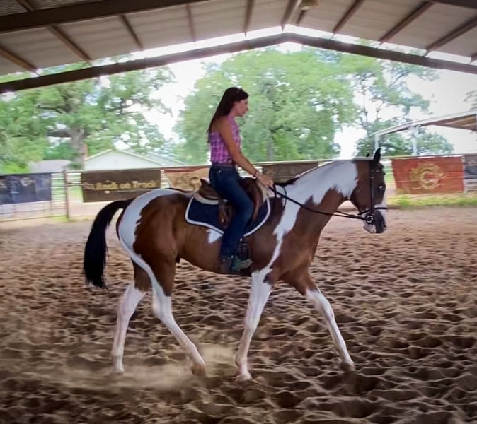 ONLINE AUCTION Place your bids at www.PlatinumEquineAuction.com Starting Bid $3500 Auction ends July 14th, 2024 Need a new saddle? Check out White Rock Saddles on our website or Facebook! Jumanji is an all around flashy dream horse. He’s the kind you can take and do anything you’d like with! Jumanji is a 10 year old grade paint gelding that stands 16 hands tall. Don’t let his size push you away, this guy is a gentle giant. He is gentle no matter if you ride him 5 days a week or once a month, he does not get fresh with time off. He will ride western or English, knows the barrel pattern, and trail rides anywhere the very best. Jumanji rides one or two handed, neck reins, moves off your leg and walks with a low head on a loose rein. He will only go the speed you ask. If you’re looking for a nice calm easy horse to take out and enjoy with friends, this is your guy! We’ve ridden him through town, through drive thrus, and countless miles of trails. Jumanji absolutely loves water and will stop and play in it! He will cross deadfall, bridges, streams, railroad tracks and anything else you may come across without hesitation. This gelding is easy going and not spooky, he takes on any task whyith ease and a steady mind. Jumanji has been exposed to leaf blowers, flags, weed wackers, dogs, four wheelers, traffic, tractors, and cattle. He has also been lightly started over small cross rails jumping and shows promise there, he could make someone a nice flashy hunter. Jumanji has been hauled to playday events and loves to run the barrels, he won’t be your next 1D horse, but he is safe and fun for any level of rider to take and enjoy, without worry. He is freshly shod a week ago, UTD on teeth and chiropractor. He stands tied anywhere, loves baths and grooming, loads and unloads and hauls quietly, and is fantastic for the farrier. Truly, Jumanji is a no worries type of gelding that can be used for any job, by any level of rider, and comes in a flashy package too! Please don’t hesitate to text or call Claire Siebols 435-899-0508 for more info. Located in Grapeland, TX. ONLINE AUCTION Place your bids at www.PlatinumEquineAuction.com Starting Bid $3500 Auction ends July 14th, 2024 Need a new saddle? Check out White Rock Saddles on our website or Facebook!