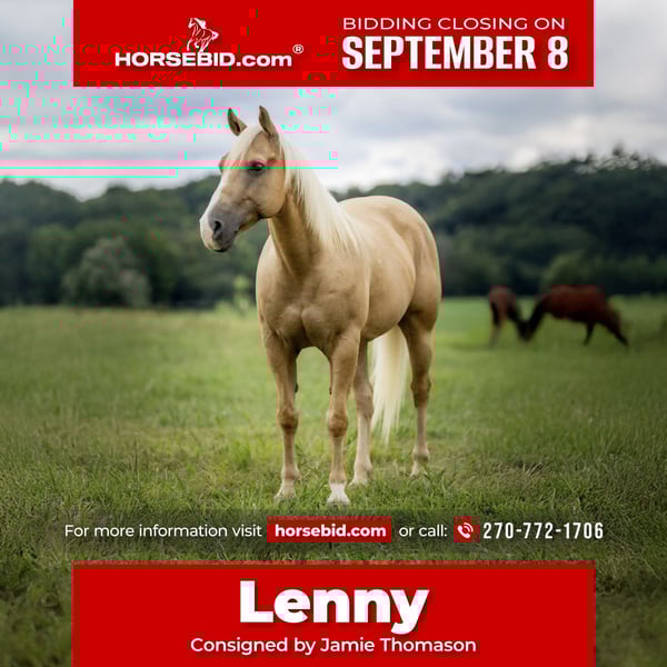 ♦️ 𝐭𝐡𝐞 𝐒𝐞𝐩𝐭𝐞𝐦𝐛𝐞𝐫 𝑺𝒆𝒍𝒆𝒄𝒕 ♦️ Happening now thru MONDAY | SEPTEMBER 8th - Available EXCLUSIVELY on HorseBid's website! For more details and to register visit: www.Horsebid.com CONSIGNOR CONTACT: Jamie Thomason 270-772-1706 LOCATION: Auburn, KY BREED: AQHA REGISTERED: Yes REGISTERED NAME: PEPPY CUTTER PAL COLOR: Palomino HEIGHT: 14.1 AGE: 13 GENDER: Gelding We are beyond proud to offer LENNY! A beautiful 13-year-old, 14.1 hand palomino gelding that is as gentle, quiet, and friendly as they come. He’s the kind of horse you can trust—perfect for beginner riders or first-time horse owners. He’s safe, he’s dependable, and he’s kid-approved! Lenny has been used as a jungle gym more times than we can count! The kids climb all over him, ride him bareback with just a halter and lead rope, & he is beyond tolerant of all their shenanigans. He provides hours of backyard fun and peace of mind for parents. The fun doesn’t end there… Lenny is perfect for the kids to ride along on the trail. He’s steady, sure-footed, and confident. Crosses water and downfall without hesitation, goes up & down inclines, navigates rough & rocky terrain, rides out alone or in a group, and always takes care of his rider. Lenny is our go to when we have non horsey guest join us on the trail. We know that he is safe and will provide an enjoyable ride. If you have a child not ready to ride alone or two children that may need to share a horse…no worries. You can put a “buddy seat” behind the saddle on Lenny that allows an additional rider to comfortably come along on the trail. Lenny is my first choice when I want to saddle up & go ride. I’ve pulled him out of the barn on a cool morning and just headed out. We’ve traveled across pastures, explored trails, went down the road, crossed four lane traffic, visited neighbors, and ridden on in to town. Every single time, Lenny has provided the calm & peace that I was after. He repeatedly reminds me why I love horses. Lenny has proven he’s the safe & steady type everyone is after, but he also isn’t afraid of a days work. He’s seen big country, logged lots of outside miles, and knows ranch work like the back of his hoof. He’s checked fences. Opened & closed a lot of gates. He’s gathered, sorted, & penned. He’s been used to rope & doctored cattle. Wild or rowdy stock doesn’t rattle him, he’s there to get the job done. Lenny is pretty exceptional. He’s a pleasure to have around. Always easy to catch, he comes running when I whistle. Stands tied wherever you decide to park him, a gentleman to load & haul. An easy keeper, He can be stalled or pasture kept. Patiently stands for grooming, saddling, mounting, and for the farrier. Whether you’re looking for a safe mount for your kids, a confidence builder for guests, or a reliable partner for work or play—this guy is the total package. If you would like to meet Lenny or have any further questions, feel free to reach out! Contact Jamie @ 270-772-1706. Lenny sells current on all cares & we can assist in arranging shipping to anywhere!