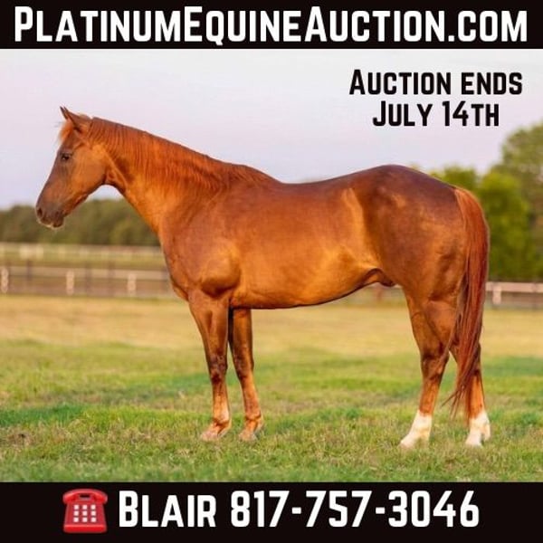 ONLINE AUCTION Place your bids at www.PlatinumEquineAuction.com Starting Bid $3500 Auction ends July 14th, 2024 Need a new saddle? Check out White Rock Saddles on our website or Facebook! “Dump truck” is a 14.3H, 2013’ AQHA chestnut gelding. This one does it all, watch his whole video!! From the ranch, to the roping pen, to the McDonald’s drive through, to the street and even INSIDE Tractor Supply, this guy will keep you absolutely safe! Dump Truck is one of the most versatile horses we’ve come across! He’s very gentled natured, easy to get along with, FANCY broke with all the buttons and SANE! He affectionately got his name from the a team roper who thought he dropped his booty like a dump truck…..and it sure fits him! He is a finished high number heel horse and has been hauled to a handful of jackpots recently. For the past few years, he was owned by an older gentleman who unfortunately passed away. He is safe and gentle for anyone to handle and he can go from the trails, to town, to the roping pen and not skip a beat. He’s not spooky and has ZERO buck, bolt or rear. Dump Truck has a very sweet, kind personality and gets along with everyone and everything! He is an easy hauler, loader, tier, and just plain easy to get along with in general with everything! He’s seen it all, even the inside of Tractor Supply and he acted like it was his 100th trip to the store for his favorite feed. He’s very handy broke and neck reins, moves off leg and stops with absolute ease. He picks up both leads great and will not switch gaits unless asked! Dump truck would excel for any higher number heeler, trail rider, rancher, handy kid or anyone just looking for an absolute fun one to enjoy! We also think he would make a jam up little barrel horse and we may experiment with that, so watch our website for those videos!! He would quickly make a breakaway horse and if patterned, he’d be the perfect junior rodeo horse! He would also make a sorting horse easily! Dump truck has TONS of heart and try! He LOVES to go to work and make you happy! He’s UTD on feet, coggins and teeth and ready to go! If you’re looking for a safe, honest absolute BLAST of a horse to ride, DO NOT miss Dump Truck!!! Go to his website page northtexashorsecompany.com/dumptruck for more pictures and footage! Dump Truck is a registered AQHA gelding! He will be selling WITHOUT his papers due to his previous owner’s passing and them being lost! The only way for a buyer to have papers in hand is to send in DNA after purchasing!! Papers are not guaranteed! His pedigree is listed in the pictures on our website, and he has been confirmed by previous family to be the horse shown on the pedigree! Please call Blair with North Texas Horse Company for more info at 817-757-3046. We are located in Weatherford, TX and can help arrange affordable shipping to anyone!! ONLINE AUCTION Place your bids at www.PlatinumEquineAuction.com Starting Bid $3500 Auction ends July 14th, 2024 Need a new saddle? Check out White Rock Saddles on our website or Facebook!