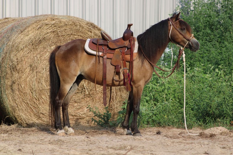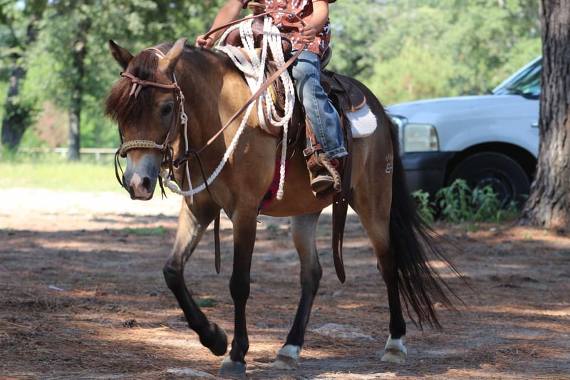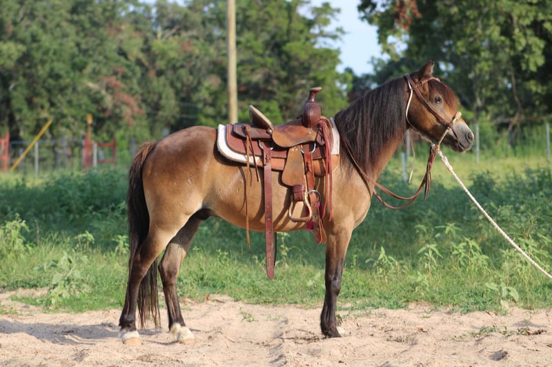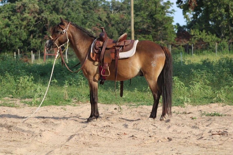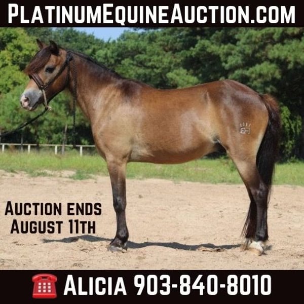 ONLINE AUCTION Place your bids at www.PlatinumEquineAuction.com Starting Bid $3500 Auction ends August 11th, 2024 Need a new saddle? Check out White Rock Saddles on our website or Facebook! If you are in the market for an excellent all-around pony for your children, check out Tony. Tony is a 12 year-old gelding who stands 11.1 hands tall. He is a beautiful sooty buckskin color with the cutest little face marking. Tony has excellent feet and a gorgeous full mane and tail. Tony has been used both English and western. He has been a lesson program for children, he’s been around cattle, has done play days and is an excellent trail pony. Tony will go wherever you point his head and is very honest and forgiving when it comes to young riders. Tony is extremely safe on the ground. A child can handle him from catching, rooming, bathing, picking his feet, and anything else you could want to do with him. He will load in any trailer. He will stand tied without a fuss stand for a young child to climb aboard. Tony will not go any faster than his rider will ask him for and he also has a very good set of brakes. He will ride in a bit or a pony Hackamore. We have also ridden him bareback a lot. Tony has been on several trail rides and does well keeping up with the larger horses. He will jump logs and go through water. he is not spooky about things. He is not buddy or barn sour and he gets along with a mixed herd. He’s been around all types of farm machinery, traffic safe and is used to dogs being underfoot. Tony is one neat little pony and is ready for his next kiddos to teach how to ride. If you would like more information on him please don’t hesitate to call or text Alicia Darling 903-840-8010 Located in WIllis Point, TX. ONLINE AUCTION Place your bids at www.PlatinumEquineAuction.com Starting Bid $3500 Auction ends August 11th, 2024 Need a new saddle? Check out White Rock Saddles on our website or Facebook!