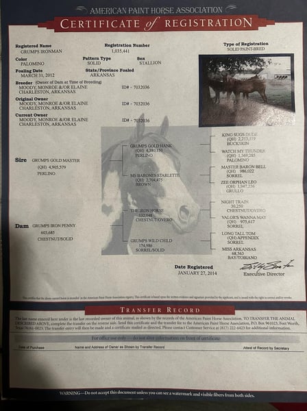 ONLINE AUCTION Place your bids at www.PlatinumEquineAuction.com Starting Bid $3500 Auction ends February 3rd, 2025 Need a new saddle? Check out White Rock Saddles on our website or Facebook! If you’re on the hunt for a calm, cool, and collected equine partner, look no further—Grumps Ironman, affectionately known as Oliver, is your guy! This handsome 2012 model registered APHA gelding stands a sturdy 15.1 hands tall and is simply a joy to be around. Oliver is the epitome of safe and reliable. No matter what you’re doing, this super docile and easy-going fella is always there for you. He’s been trail riding for countless miles in the beautiful Ozarks and all across Texas, and he’s seen it all without a worry. Whether it’s crossing rivers and streams, tackling hills, or navigating bridges and downed logs, Oliver handles everything like a pro. He is gentle and trustworthy 365 days a year, making him perfect for the whole family to enjoy. He will carry a flag, been to numerous parades, and has been used to move cattle. Want to light some firecrackers or shoot a gun? No problem! Oliver handles that no problem. He’ll walk, trot, and lope circles with a smooth, effortless gait that makes riding a true pleasure. Picture yourself cruising down the trail with a cold drink in hand—Oliver is the perfect partner for that! He’s also great with heavy traffic and bustling crowds. Just ask him about his adventures down Exchange Ave at the historic Fort Worth Stockyards! With horse-drawn carriages, crowds of people and loud music all around, Oliver took it in stride like a seasoned pro. This laid-back guy is a true unicorn—gentle from the ground to his back. Oliver is the best insurance plan you can find when it comes to having a safe and enjoyable ride. He just got a fresh set of shoes and is ready to hit the trails! He stands tied, bathes easily, is great for the farrier, and loads and unloads from the trailer with zero issues. So, if you’re looking for a horse that embodies calmness and reliability, Oliver is the one for you! Come meet him and see for yourself what makes him so special! Contact M$ Performance Horses to come try him, or we can set up a FaceTime call at 661-817-9120 Located in Stephenville, TX. If you need help with transport don’t hesitate to ask we have a list of reputable haulers that can get him safely to your doorstep WORLD WIDE including, Alaska , Mexico, Hawaii and Canada. ONLINE AUCTION Place your bids at www.PlatinumEquineAuction.com Starting Bid $3500 Auction ends February 3rd, 2025 Need a new saddle? Check out White Rock Saddles on our website or Facebook!