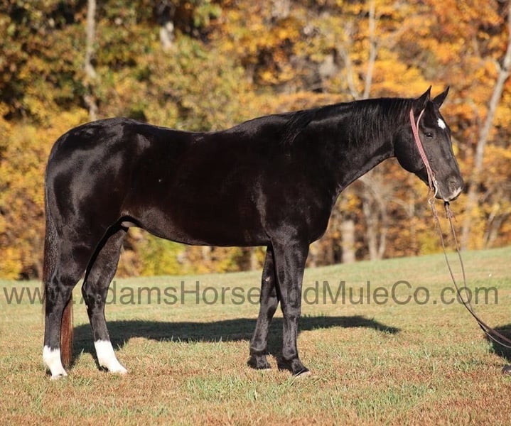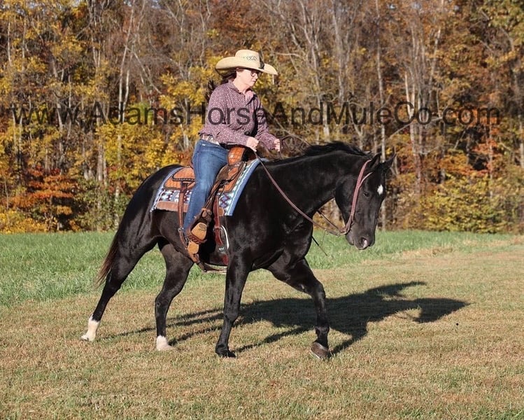 Go to www.AdamsHorseAndMuleCo.com for more pics and a video. AHAMC has been in the horse business and sold horses over the internet since 2005. We have a long track record of success with hundreds of happy customers. We work hard to match riders with the correct horses and specialize in beginner safe, family friendly horses that have been used and checked out by our family! Color Me Black aka Blackie is a well built jet black gelding standing 15.2hh. He is a 2012 Model registered in the AQHA with a good pedigree. Blackie has been used around the ranch checking cattle and he has roped and doctored several as well. He knows all about ranch work and is prepared to help you anytime that the situation calls for it! Blackie loves to just cruise along slow and easy down the trails and he is a horse that the whole family can ride and enjoy! He is an excellent trail horse and has been ridden in multiple states. He will cross creeks, ditches, logs and navigate rough rocky areas. He is safe riding in traffic. He has a smooth jog, a nice lope, has a good stop, turns a circle both ways and backs with ease! Blackie is a confident horse on the trails and will lead the crew or head out alone with no issues! He has been exposed to all kinds of wildlife such as deer or turkey and will go anywhere that he is asked too. He has been ridden many miles in the mountains of Eastern Kentucky and encountered every obstacle possible on the trail. He will go up or down even the steepest slopes, across deep creeks, over downed trees, and over all types of rough terrain while still being sure footed. Blackie is not cinchy, cold backed, does not crib or weave. Blackie is a horse that anyone would be proud to own and one that anyone will love!!! Feel free to call Eric 606-308-2461 with any questions.