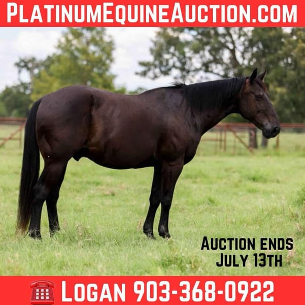 ONLINE AUCTION Place your bids at www.PlatinumEquineAuction.com Starting Bid $3500 Auction ends July 13th 2025 Need a new saddle? Check out White Rock Saddles on our website or Facebook! Jumbo is a 14 year old coal black gelding that stands 14 hands and built to last this gelding has been a family favorite for quite some time now. Jumbo is a been there done that type of gelding he has seen all the lights, flags, banners etc. and even stands to shoot off of. This is the type of gelding everyone looks for that just wants to enjoy riding through the trails or simply checking your fences. Jumbo has a nice time hand neck reign handle and rides low headed he stands to be mounted and has the smoothest little gate. Leave this gelding off for months at a time and when you catch him back up he will ride off as if he’s been ridden every day. This is a true and safe family gelding that anyone would be lucky to own! Contact Logan with X5 Ranch 903-368-0922 with any questions. Located in Canton, TX. ONLINE AUCTION Place your bids at www.PlatinumEquineAuction.com Starting Bid $3500 Auction ends July 13th 2025 Need a new saddle? Check out White Rock Saddles on our website or Facebook!
