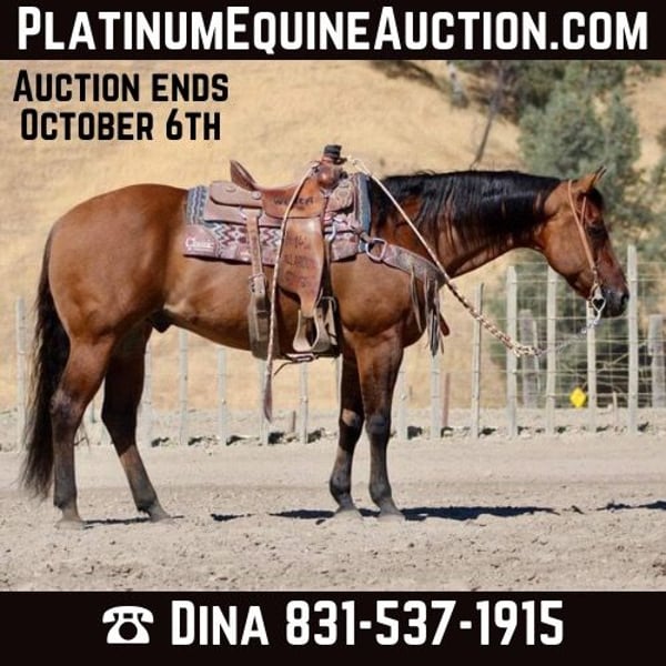 ONLINE AUCTION Place your bids at www.PlatinumEquineAuction.com Starting Bid $3500 Auction ends October 6th, 2024 Need a new saddle? Check out White Rock Saddles on our website or Facebook! Rolex Starlight We are excited to introduce our newest addition a stunning 2011 AQHA dun gelding standing at 15 hands. This horse is the epitome of versatility and is perfect for anyone looking for a fancy, broke show horse that can also be gentle and safe enough for kids and grandmas to ride. Not only does this gelding have a phenomenal pedigree with names like Gray Starlight, Hollywood Duntit, and Colonels Smoking Gun, but he also has the skills to match. He is not just a pretty face; his abilities speak volumes. He is super broke and extremely kind, making him suitable for the entire family. When it comes to riding, this gelding shines in every aspect. His lope is smooth and effortless, his circles are precise and beautiful, his sliding stop is flawless, and his spins are seamless. Whether you want to take him out on the ranch or into the show ring, he will excel at both with ease. Rolex is superior on cows Branding is his second nature , out of the box he performs like a true gentleman. Rolex is a show stopper. This horse’s style sets him apart from others there truly is no other like him. He can be shown anywhere without any worries about safety or behavior issues. In fact, even kids can ride him down the road with confidence as he handles traffic with cars, trains, trucks effortlessly. He can navigate narrow trails or cross deep rivers and logs without hesitation while remaining calm in front of wildlife. Aside from being an exceptional riding horse, this gelding also has experience in ranch versatility classes, obstacle courses, and ranch rodeos. He truly is a jack-of-all-trades when it comes to equine activities. Handling this horse is a dream come true as well he ties, hauls like a pro, stands for the farrier or bath time,and can even be handled by little ones without any issues. Horses of this caliber do not come around often; they are irreplaceable gems in their own right. We guarantee that Rolex will steal your heart and the show wherever he goes. Whether you keep him in a pasture or a stall, he adapts well to any atmosphere. This horse is truly one-of-a-kind, and we are proud to present him to you. Don’t miss out on this opportunity of a lifetime come meet this amazing gelding today! Contact Longhorn Ranch Dina @ 831-537-1915 located in Paicines, CA. We look forward to telling you all about Rolex! ONLINE AUCTION Place your bids at www.PlatinumEquineAuction.com Starting Bid $3500 Auction ends October 6th, 2024 Need a new saddle? Check out White Rock Saddles on our website or Facebook!