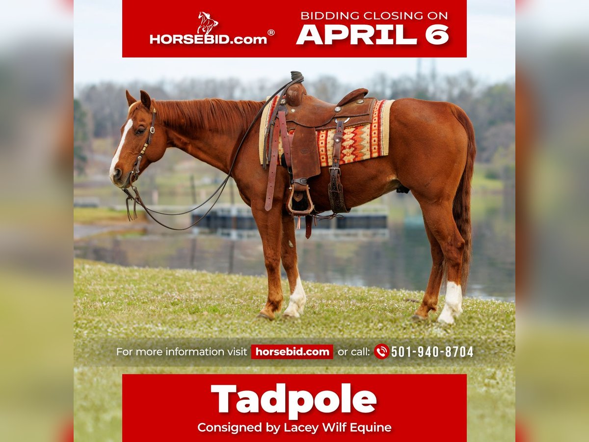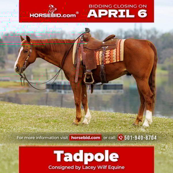 🌟𝑨𝒑𝒓𝒊𝒍 𝐀𝐋𝐋 𝐒𝐓𝐀𝐑 𝐋𝐈𝐍𝐄𝐔𝐏🌟 Happening now thru MONDAY | APRIL 6th - Available EXCLUSIVELY on HorseBid's website! For more details and to register visit: www.Horsebid.com CONSIGNOR CONTACT: Lacey Wilf Equine 501-940-8704 LOCATION: Quitman, AR BREED: Quarter Horse REGISTERED: Yes REGISTERED NAME: ELANS FLYER COLOR: Sorrel HEIGHT: 14.2 AGE: 16 GENDER: Gelding Tadpole is a 14.2 hand 2010 model registered sorrel gelding that defines what “been there and done that” is supposed to look like. He is not a horse that learned his job in pieces, he’s one that’s lived it day in and day out. From long days at the stockyards to every phase of ranch work, his experience has come from doing the kind of work that builds a horse right, and he carries that kind of honesty and dependability with him every day. He handles cattle with confidence and takes care of business wherever he’s asked. Gates, alleys, commotion, pressure, it’s all just part of the routine to him. He carries the same level head and ease no matter where you point him. Tadpole is dependable on the trail, comfortable through town, and polished in the arena with a handle that feels natural the moment you pick up the reins. Outside, he is the kind you can put your foot in the stirrup and go, whether you’re headed out alone or in a group. He crosses water, logs, ditches, and uneven terrain without hesitation, picks his way through rough country with a sure foot, and stays quiet in new places or unfamiliar surroundings. He’s the same horse leaving the barn as he is miles down the trail, content to just go along at whatever pace you ask. In the arena, he has a big stop when you so much as whisper “whoa,” rolls through a turnaround with balance and purpose, and stays soft and collected without effort. For those that appreciate feel, he’s the kind you can ride with just a string around his neck and get along with him just the same. Whether he’s been in steady work or given time off, he comes back the same consistent, willing horse every time. He would step right into a team sorting pen and feel right at home, with his timing, cow sense, and responsiveness. Day to day, Tadpole is easy to have around and easy to get along with. He’s straightforward to saddle, groom, shoe, bath and haul with no extra maintenance or fuss. He understands his job, respects his rider, and goes about his work with a willing attitude. The only note is that in a large pasture he can be a touch hard to catch, but a little grain goes a long way and he knows the routine. Tadpole is the kind that doesn’t need explaining and will take care of most levels of rider. Seasoned, honest, and as proven as they come, he’s the type that has already seen it, done it, and is ready to keep doing it without skipping a beat!
