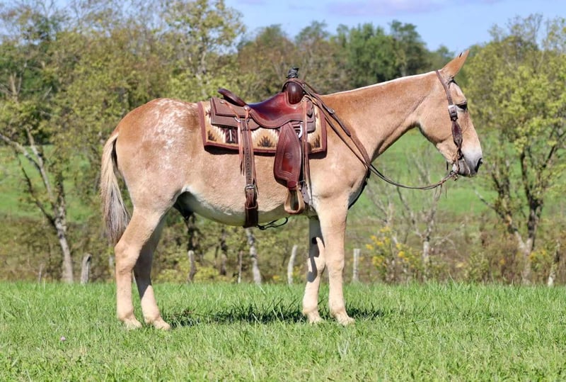 ONLINE AUCTION Place your bids at www.PlatinumEquineAuction.com Starting Bid $3500 Auction ends November 3rd, 2024 Need a new saddle? Check out White Rock Saddles on our website or Facebook! Rhodey is a 14 year old, 15.3 hand John mule. He is as quiet and gentle as they come as well as friendly and in your pocket. Rhodey has had extensive training throughout his life and is a joy to ride. He walks, jogs, and lopes nicely. He rides gathered up and soft in the bridle like one should. One step and he’s in a rocking chair lope. He neck reins and works off the leg. Backs and side passes nicely. He’s been shown in local horse shows and is competitive against the horses. You can open and close gates with him. As for trail riding, he is a dream. He goes through deep water, isn’t afraid of deer or turkeys when coming across them. He steps over logs and will leave the group when asked. He also rides out alone. Rhodey is traffic safe if you need to ride on the road or want to take a quick ride through town. There isn’t a way to ride him wrong. Bareback, with a saddle, or 2 or 3 kids lined up down his back. He is fun and a mule you can trust! He stands nicely for the farrier, is easy to clip, ties well and travels nicely. Rhodey is not a mule you have to ride everyday. You can give him the entire winter off and when you come back to ride him in the spring, he is just the same as he was at the end of summer. For more information, please call/text Sammi Waugh 704-798-5497 Located in Brooksville, KY. ONLINE AUCTION Place your bids at www.PlatinumEquineAuction.com Starting Bid $3500 Auction ends November 3rd, 2024 Need a new saddle? Check out White Rock Saddles on our website or Facebook!