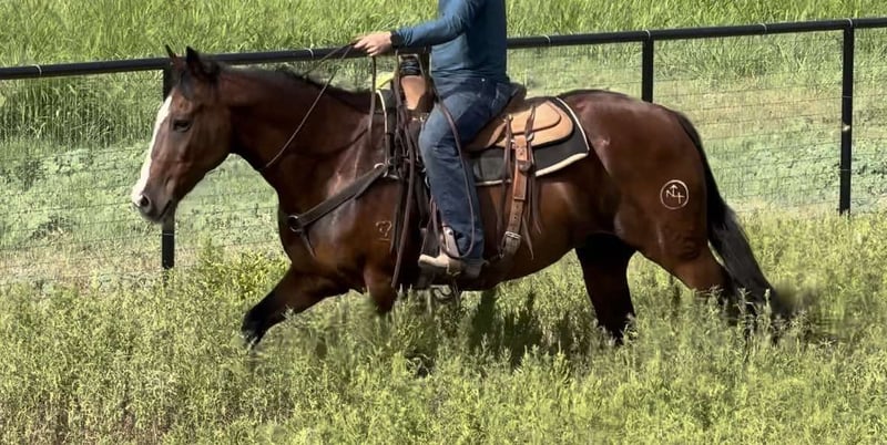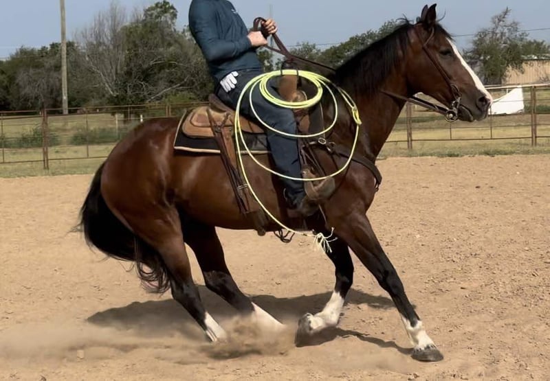 ONLINE AUCTION Place your bids at www.PlatinumEquineAuction.com Starting Bid $3500 Auction ends October 13th, 2024 Need a new saddle? Check out White Rock Saddles on our website or Facebook! Riggin is a 15.1H, 15 yr old grade bay gelding. He has been a personal switchender of ours for several years and carries our brand. Only horses that have had a profound impact on our lives get the honor to be branded in our program. He is a confidence booster for a beginner to learn how to rope on, or an absolutely safe mount anywhere for anyone! He’s one you can trust your kids on in the roping pen to the pasture! Broke broke broke with a really nice handle. Please give us a call for more info, it would simply take too long to type about how good this gelding is. He is everything you want in a confidence booster, first rope horse, old lady trail horse, kid lesson horse, or ranch horse. Riggin’ will give you a mile when you ask for an inch. He was born to please and will absolutely not step out of line. He is very very special to us and we wouldn’t mind holding him until our son can ride solo, but that wouldn’t be fair to the person that needs one like him today. Riggin is extremely comfortable at all gaits and has the very comfy rocking chair lope. He’d be the perfect horse for a beginner roper on either side. He’s 100% calm cool and collected in the box and puts you exactly where you need to be on both sides! You don’t have to rope on this horse to enjoy him though! He is a solid, sane citizen and anyone will stay safe on his back! He’s seen everything there is to see and takes to town, cars, bikes etc great! We’ve taken him multiple times to the stockyards to enjoy a cold beer on a Saturday night. Riggin is the old ranch horse everyone is asking for but no one can find because few too many like him ever come available! He’s UTD on all things and is ready to go! More pics and videos, including roping footage will be on his website page at northtexashorsecompany.com/riggin and the video of him at home was his first ride in MONTHS! This gelding is the same horse every single ride and doesn’t need “refreshed” after months off! ZERO buck, bolt, rear or bad habits. This guy will take care of anyone!! Please call Blair with North Texas Horse Company for more info at 817-757-3046. We are located in Weatherford, TX and can help arrange affordable shipping to anyone!! ONLINE AUCTION Place your bids at www.PlatinumEquineAuction.com Starting Bid $3500 Auction ends October 13th, 2024 Need a new saddle? Check out White Rock Saddles on our website or Facebook!