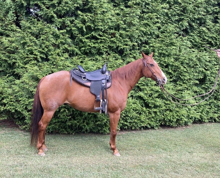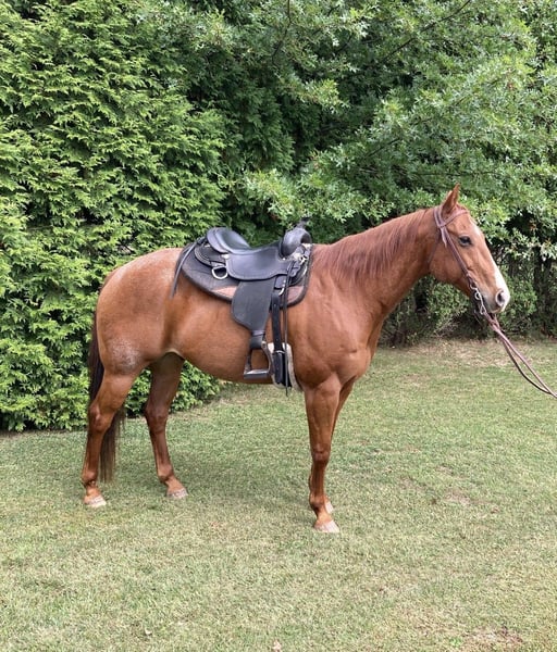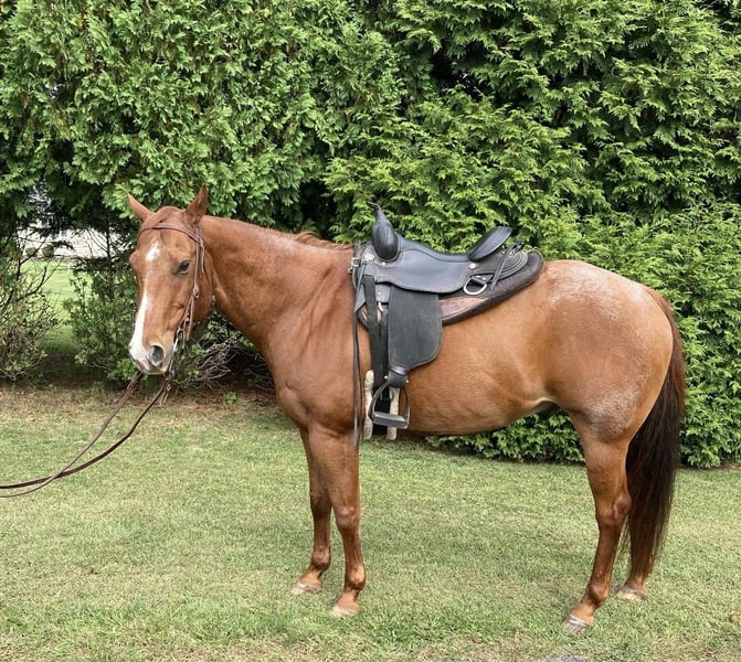 Beau is a sweet, gentle, red roan gelding Quarter Horse