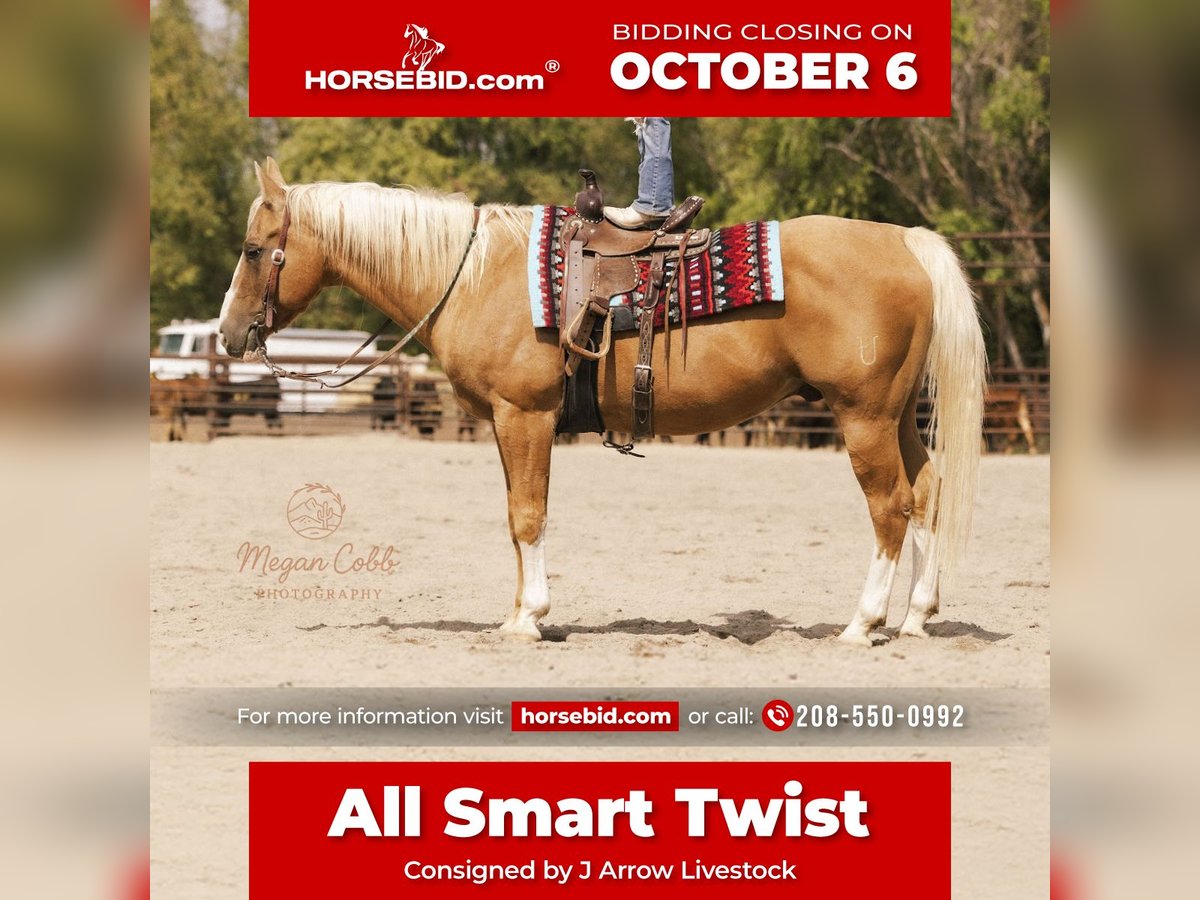 🍂 𝓐𝓾𝓽𝓾𝓶𝓷 𝑨𝑳𝑳 𝑺𝑻𝑨𝑹 𝑳𝑰𝑵𝑬𝑼𝑷 🍂 Happening now thru MONDAY | OCTOBER 6th - Available EXCLUSIVELY on HorseBid's website! For more details and to register visit: www.Horsebid.com CONSIGNOR CONTACT: J Arrow Livestock 208-550-0992 LOCATION: Caldwell Idaho BREED: Aqha REGISTERED: Yes REGISTERED NAME: All smart twist COLOR: Palomino HEIGHT: 15 AGE: 18 GENDER: Gelding Hollywood is a kids horse deluxe. He’s a money winning show horse in cow horse events and in the reigning. He’s also been roped on and been on lots of trail rides. He’s BROKE everyday. He will teach a young one how to ride and show. They don’t come better trained than Hollywood. He’s good with other horses or in the stall. Hollywood has no vices whatsoever. He deserves a great home, with a family that will enjoy him like we have. Please call fmi 208-550-0992.