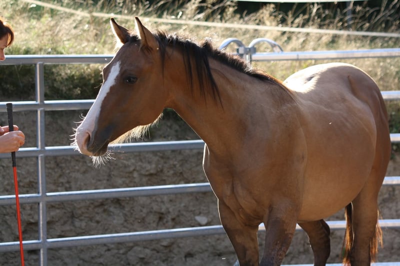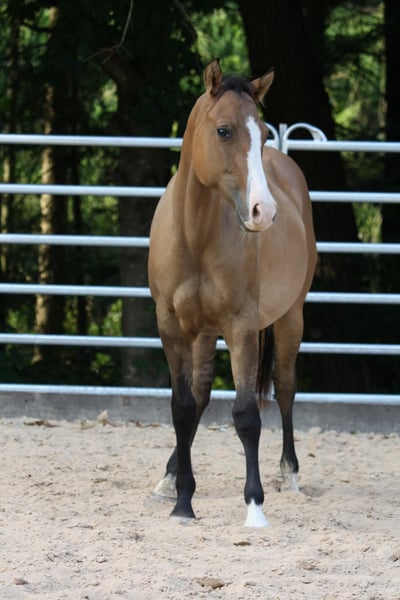 Queens King Gun - ein bildschöner Quarter Horse/Paint Horse Wallach, geboren am 11. Mai 2024, in der auffälligen Farbe dun. Er ist doppelt registriert bei der AQHA und APHA und wird voraussichtlich ein Endmaß von etwa 153 cm erreichen. Mit seinem korrekten, kompakten und kräftigen Körperbau, der guten Bemuskelung und der harmonischen Oberlinie bringt er alles mit, was man sich von einem zukünftigen Sport- oder Freizeitpferd wünscht. Er stammt aus einer qualitativ hochwertigen Allround-/Reining-Abstammung und ist genetisch 7-Panel n/n getestet. Queens King Gun wächst artgerecht im Offenstall in einer kleinen, gemischten Herde auf, kennt aber auch Boxenhaltung. Er ist sozial in der Gruppe, zeigt sich sehr menschenbezogen und freundlich und beeindruckt durch seine ruhige, gelassene und verschmuste Art: Dabei ist er unkompliziert im Umgang, zeigt ein gutes Nervenkostüm und lernt schnell. Der junge Wallach wird täglich gehändelt, ist halfterführig und wird spielerisch an Horsemanship herangeführt. Er kennt den Umgang mit Hunden, Traktoren und weiteren Alltagsreizen. Regelmäßige Impfungen und Entwurmungen sind selbstverständlich. Tierarzt und Hufschmied sind ihm vertraut, und er ist gesund, fit und altersgerecht erzogen. Bei Abgabe bringt er AQHA- und APHA-Papiere, einen Equidenpass sowie eine Zuchtbescheinigung mit. Ob als zukünftiges Showpferd oder verlässlicher Freizeitpartner - mit seinem hervorragenden Charakter und vielseitigen Potenzial ist Queens King Gun ein echtes Versprechen für die Zukunft.