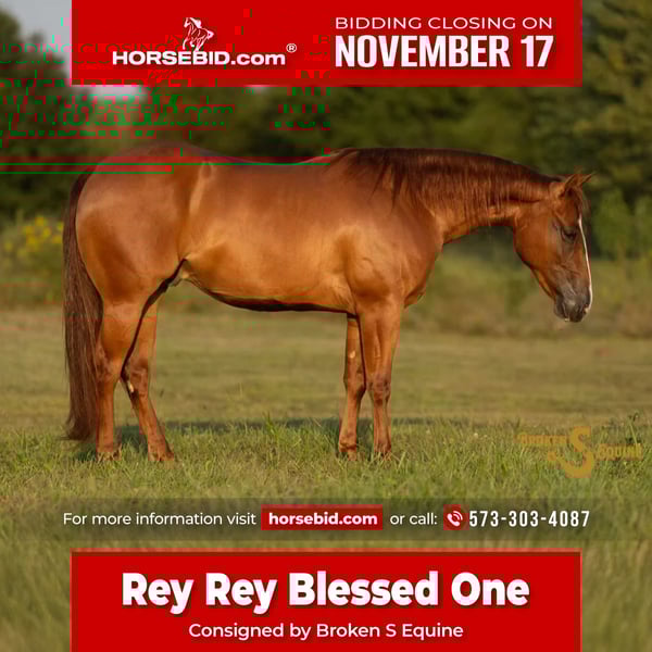 🎲𝓽𝓱𝓮 𝐑𝐈𝐃𝐄𝐑'𝐒 𝓒𝓱𝓸𝓲𝓬𝓮🎲 Happening now thru MONDAY | NOVEMBER 17th - Available EXCLUSIVELY on HorseBid's website! For more details and to register visit: www.Horsebid.com CONSIGNOR CONTACT: Broken S Equine Beau 573-303-4087 LOCATION: Bogard, MO BREED: Quarter Horse REGISTERED: Yes REGISTERED NAME: Rey Rey Blessed One COLOR: Sorrel HEIGHT: 14 AGE: 2 GENDER: Gelding Rey Rey Blessed One is a 2023 gelding standing 14 hands high, and should finish at 14.2/3. Rey Rey is by the NCHA money earner Reydioactive, who is by the all time great Dual Rey. He is out of a producing mare by Blessed Twice. Rey Rey has had 120 days of professional training and is started on the flag. He has a lot of style and feel to him with the right mind. He is very gentle, quiet, and easygoing. Rey Rey has a ton of cow to him and will excel in a cutting or cow horse program. He has been hauled to different places and rides off like a seasoned horse everywhere he’s gone. He sells 100% sound and has all the tools and fundamentals to make a winner. ⚫️Our program aims to train and produce top quality horses and ponies for all disciplines and experience levels. Check out our website for testimonials! ⚫️We are located in Bogard, MO. We can help you arrange shipping anywhere! ⚫️For more information about Rey Rey, or any of our other horses call or text us. Kieran 908-645-2127 Beau 573-303-4087