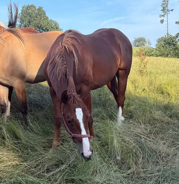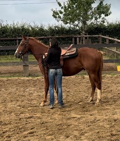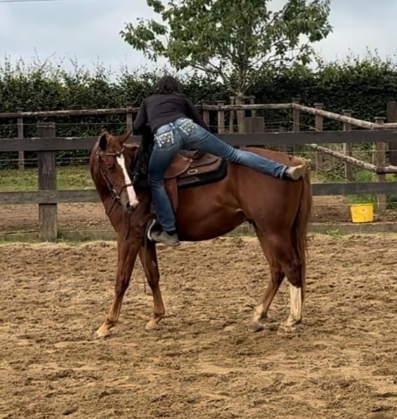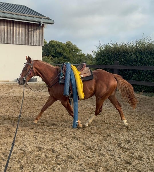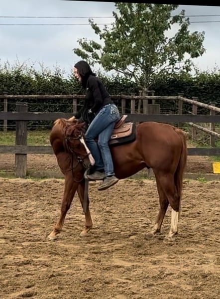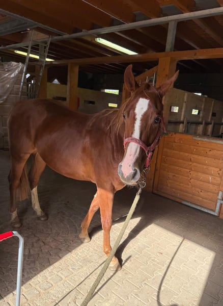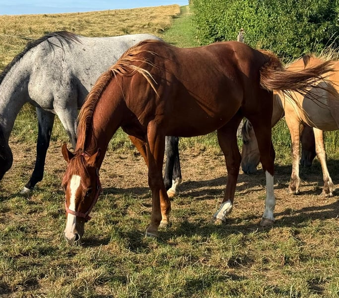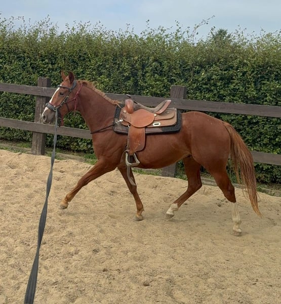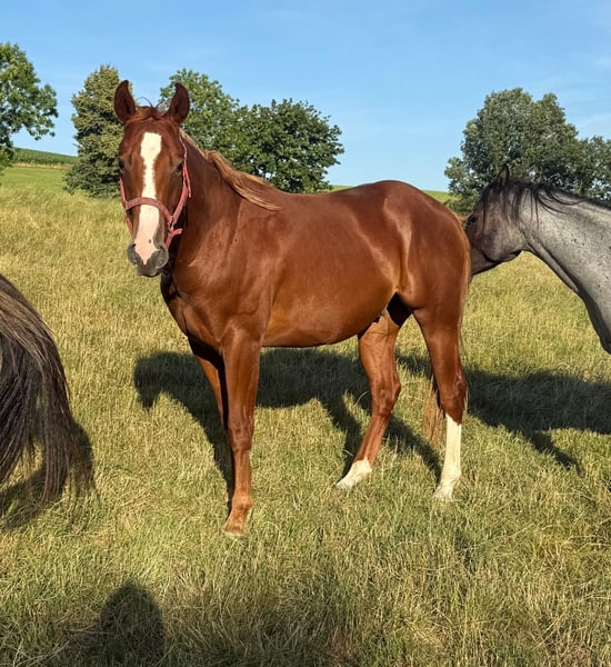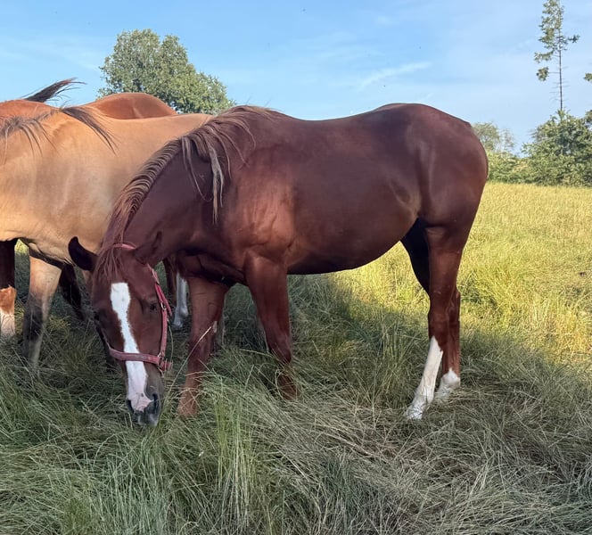 Zum Verkauf steht ein 2 Jahre alter (05.2023) Quarter Horse Wallach mit toller Abstammung. Er ist sehr gut und kräftig gebaut und wird etwa 153cm groß. Er zeigt super Bewegung und ist absolut brav im Umgang. Er kennt schon ziemlich viel, lässt sich ohne Probleme verladen, steht brav angebunden und arbeitet sehr gerne bei der Bodenarbeit mit. Er läuft bereits ohne Probleme mit Sattel, kennt Longieren und das Fahren in der Doppellonge. Aufgrund des Alters ist er noch nicht angeritten nur gut vorbereitet. Er ist ansonsten artgerecht in der Herde aufgewachsen und kennt Offenstall sowie Box. Wer einen tollen Partner zum selber Ausbilden für Freizeit oder Sport sucht, ist bei Ihm genau richtig. Krankheiten oder Allergien sind nicht bekannt. Eine AKU darf gerne gemacht werden. Für das Ausprobieren des Pferdes berechnen wir 35€. Beim Kauf wird dies gutgeschrieben. Gerne anrufen oder eine Nachricht senden 0157 36803742 Alle Angaben ohne Gewähr, Preisänderungen vorbehalten, Transport möglich, Onlinekauf möglich