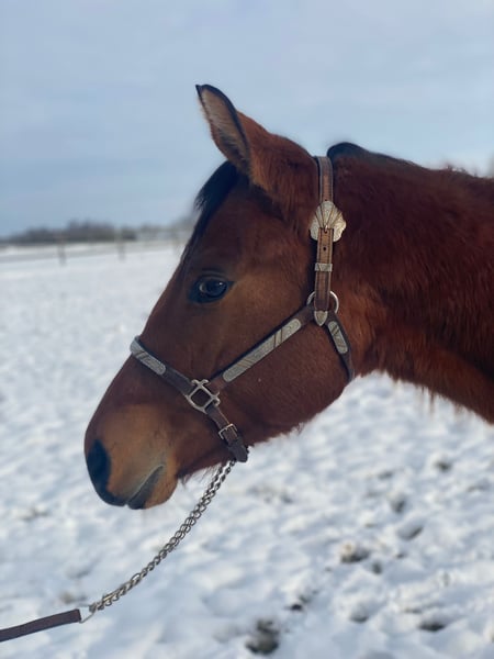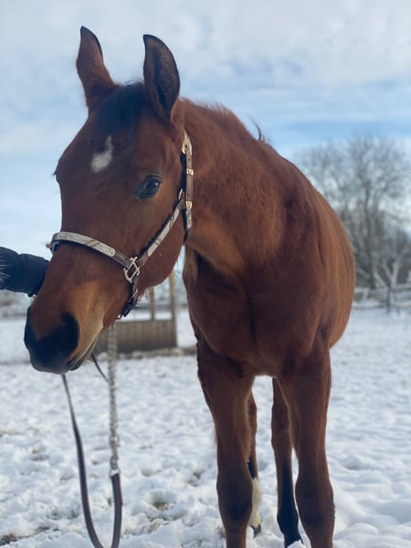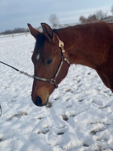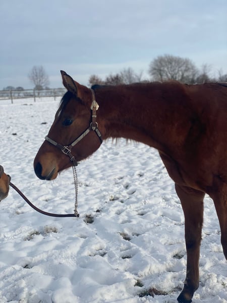 Kruzinonagreenline, a Quarter Horse gelding born on May 23, 2024, in bay, with an estimated final height of approximately 16.0 hh, is a stunning, correctly built, and very well-developed young gelding with balanced musculature and harmonious conformation. Jacob exhibits smooth, good movements and comes from an excellent all-round and pleasure pedigree, making him ideally suited as a future sport horse for pleasure and all-round classes. (Keep On Crusin x Green With Invy). He has a very sweet, human-oriented character, is open-minded, curious, attentive, easy to handle, and extremely well-behaved in daily interactions. The gelding is eager to learn, talented, and leaves no wishes unfulfilled in his nature. He is calm and cooperative with the farrier and veterinarian. Jacob is healthy, 6-panel n/n, vaccinated, regularly dewormed, and undergoes routine blood tests. He was raised in an appropriate manner, familiar with both box and pasture turnout. Jacob masters the basics of foal handling, is halter-trained, and loads onto the trailer without issues. A small scar on his front leg does not affect him in any way. He is eligible to compete in the DQHA Futurity, has been entered into the EWU young horse program, and his siblings are already successful in all-round sports. With a heavy heart, he is being offered due to the owner’s retirement from riding, into a loving and nurturing home. He is an excellent young prospect with great potential and ideal prerequisites for a successful future in sport.