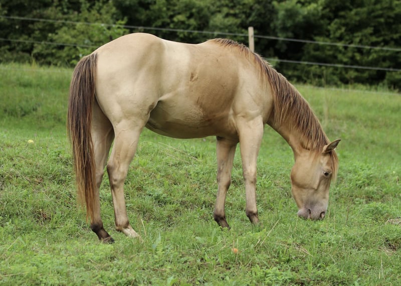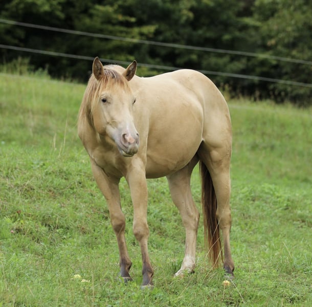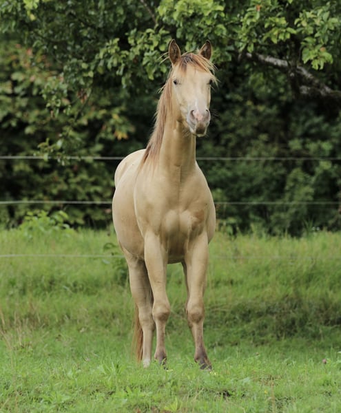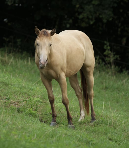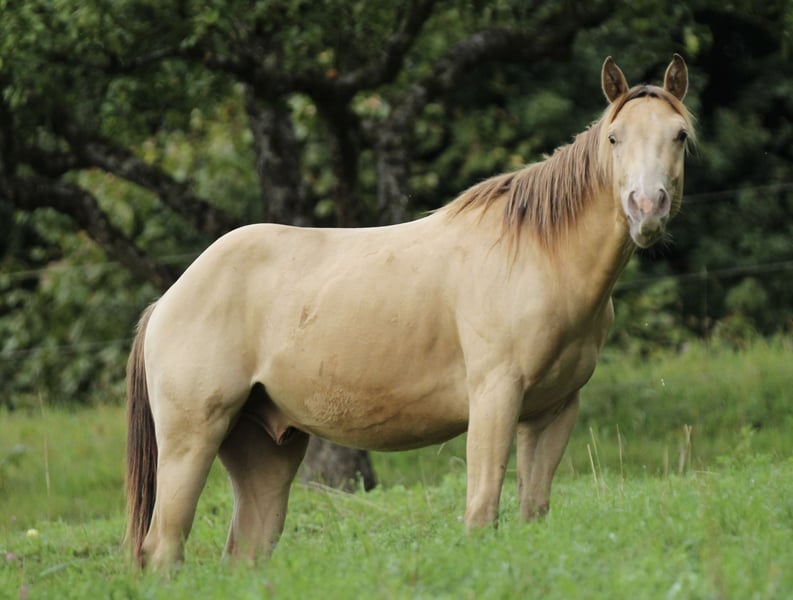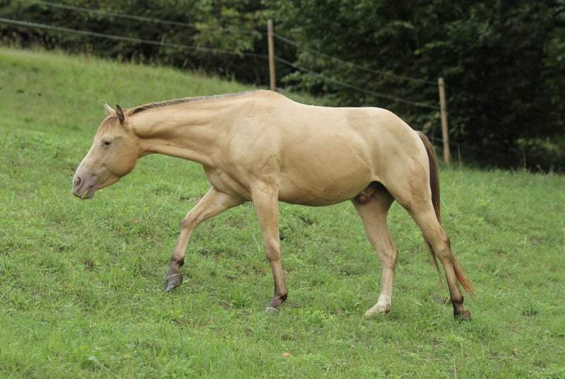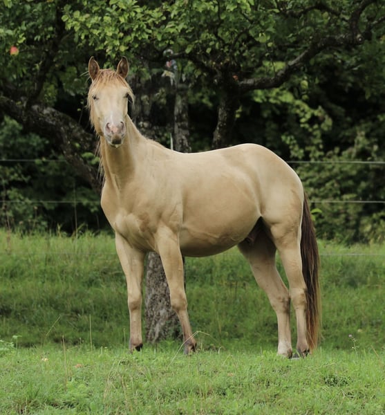 "Kizz" is a wonderfully sweet and friendly young Quarter Horse gelding who often behaves more like a dog than a horse. Very easygoing, he does everything that is expected of him, loves children, and enjoys cuddling very much. He is a small gelding with an approximate height of 1.40 meters, yet he is well-proportioned and has a sturdy build for his size, with a short, strong cannon bone. Thanks to his small stature and his very affectionate nature, he makes the perfect companion for children, teenagers, and light adult riders who do not want to "disappear" on a larger horse. Kizz has grown up appropriately within a herd and is very well socialized, healthy, steady-footed, and robust. 6-panel N/N.