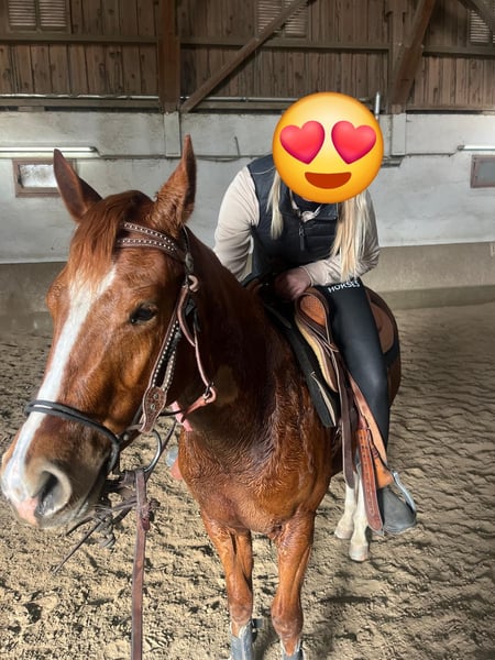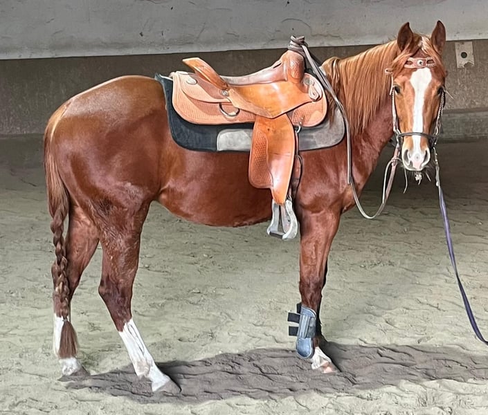 3 jähriger Quarter Horse Wallach Barhuf Doppelt registriert (Quarter Horse/Paint) 5 Panel/nn negativ über Eltern Gesund (kein Ekzem etc.) Kennt Box/Koppel Brav beim Hufschmied Wird derzeit Angeritten ( Schritt/Trab/Galopp) Sehr motiviert u fein im Handling Kann gerne mit seinem neuen Besitzer zusammen weiter ausgebildet werden! Bei ernsthaftem Interesse gerne mehr Infos etc.... unter 0179/4075376 Um Reittourismus vorzubeugen werden 35 Euro verlangt!