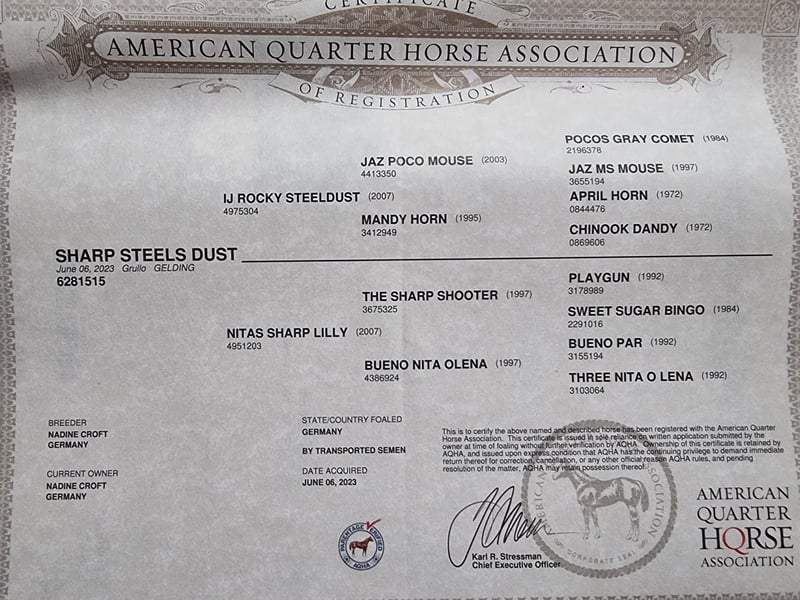2026 will be your year! You’ve long dreamed of finding your “Perfect Match,” and here it finally is! For sale is this stunning foundation-bred Quarter Horse gelding, “Don Bueno,” also known as “Sharp Steels Dust,” in the special color “Smoky Grullo.” He is a son of IJ Rocky Steeldust (Green Meadow Ranch) and already lives up to his sire’s reputation. Quarter Horse: Gelding, Born: June 2023, Expected height: approximately 15.0 hh, Color: Smoky Grullo (special coat color), Training level: “Ready to start,” Foundation/Reining/Cutting/Allround, 5-panel N/N, DQHA regional eligible to compete. Born and raised on a large pasture, in a species-appropriate environment with an age-mixed herd, alongside other colt foals, and with early handling, “Don” has developed into an exceptionally resilient and calm young horse, carefully prepared with love and attention. From the beginning, he has been able to accompany his mother in everyday life everywhere. He is farrier- and loading-friendly, knows trailer loading, even alone, can be lunged, saddled with a bareback pad and girth, and is familiar with walking out – alone or as a lead horse with his mother. He has been playfully prepared at liberty on the ground, with small lessons in side-passing, backing, stopping, moving forward, bending, parking at the mounting block, crossing wobbles, stepping onto a platform, walking through flutter tapes, puddles, narrow passages, and is familiar with desensitization training, liberty exercises in the round pen, and free-range pasture work. He knows all terrain challenges and much more. Absolutely cool and confident in handling, easy to manage with a solid foundation and good hooves. A brave “strategist” who thinks along and participates. Open-minded and people-oriented – a true cuddle “snugglebug” who loves to be groomed, kissed, and cuddled. As a reliable partner, he will soon calmly and confidently guide you through any trail course, whether at competitions or on a leisure ride. This versatile golden boy is and will be something very special. Don’t wait too long to make your decision – you can’t go wrong here. You still have the chance to train your “best buddy” yourself at this price or decide where to continue his training. Throughout this year, “Don” will get to know the riding hall of Alexander Eck in Lower Saxony, and his price will increase as his training progresses. Due to the discontinuation of horse keeping and riding, we are looking for the “perfect match” for this self-bred “all-round” dream prince in high gloss. PS: His dam, Nitas Sharp Lilly (Smoky Black breeding mare), is also for sale and guarantees foals in Grullo, Smoky Grullo, or Smoky Cream, when paired with IJ Rocky Steeldust!