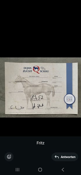 SHINERS BACK N BLACK Rufname: Duke AQHA- & DQHA-registrierter Wallach | geboren April 2023 | NN6 Mit SHINERS BACK N BLACK, Rufname Duke, bieten wir einen jungen American Quarter Horse Wallach an, geboren im April 2023 in Deutschland, der durch seine Abstammung, seine Einstellung und seinen Arbeitswillen überzeugt. Er ist AQHA-registriert, bei der DQHA geführt und wurde auf der DQHA-Zuchtschau vorgestellt, wo er eine Gesamtbewertung von 83,52 Punkten erhielt. 🔹 Abstammung Vater: ONE SHINEY TREAT Mutter: LIL COW PADDIE Weitere in den Papieren geführte Vorfahren sind u. a.: SHINING SPARK, GENUINE DOC, DIAMONDS SPARKLE, DOCS LUCKY NUMBER, PEPPY SAN BADGER, GREYHOUND STEP, PATIENCES REWARD. 🔹 Genetik NN6 (Six Panel negativ) getestet frei von HYPP, HERDA, GBED, PSSM1, MH und IMM 🔹 Charakter & Umgang Duke zeigt sich als: motiviert arbeitswillig aufmerksam gelehrig mit deutlich erkennbarer Freude an Arbeit und Beschäftigung Im täglichen Umgang ist er: halfterführig verladefromm schmiedefromm an viele Außeneinflüsse gewöhnt, darunter Hunde, Autos, Traktoren sowie allgemeiner Stall- und Hofbetrieb Duke bringt viel Motivation und Potenzial mit und möchte gefördert und beschäftigt werden. Wir wünschen uns daher bewusst erfahrene Hände, die Freude daran haben, mit einem jungen, arbeitsfreudigen Pferd weiterzuarbeiten und sein Potenzial weiterzuentwickeln. Wir kauften ihn zusammen mit seinem Halb-)Bruder, damit der Bruder in unserer kleinen Gruppe nicht als einziges Jungpferd steht. Von Beginn an war klar, dass wir ihn nicht behalten. Er kennt somit andere Pferde (jung und alt) und kann problemlos in eine Gruppe integriert werden. Wobei sich schon abzeichnet, dass er nicht zu den rangniedrigen gehört. 🔹 Eckdaten Name: SHINERS BACK N BLACK Rufname: Duke Geschlecht: Wallach Geburtsmonat: April 2023 Zuchtland: Deutschland Züchter: Iver Hansen Papiere: AQHA Certificate of Registration & DQHA-Unterlagen vorhanden 📍 Standort: Deutschland 📄 Originalpapiere vorhanden 📩 Weitere Informationen auf Anfrage