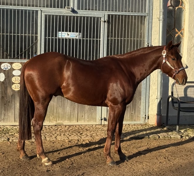 ⭐️ ⭐ 4j. AQH Wallach – Top Reining Prospect mit starker Abstammung & Perspektive ⭐ 👉 Wer ein junges, ehrliches und bereits sehr gut gerittenes Pferd mit echter Zukunft sucht, wird bei Honey sofort fündig. Honey ist ein 4-jähriger Quarter Horse Wallach, der durch seine Kombination aus Charakter, Rittigkeit und Talent überzeugt. Er ist ein Pferd, das man sofort gern hat – zuverlässig, angenehm und mit viel positiver Einstellung unter dem Sattel. Aktuell befindet er sich im Training, alle Manöver sind bereits sicher erarbeitet. Er zeigt sich dabei stets lernwillig und unkompliziert zu reiten. Besonders hervorzuheben sind seine einfachen, sauber abrufbaren Wechsel sowie seine ruhige und ehrliche Art. Durch seine Einzahlungen bei NRHA Germany und der Euro Futurity ist er bestens vorbereitet für den Reining- und Ranch Horse Sport sowie den Allround-Bereich. Im Gelände ist er ebenfalls brav und angenehm zu reiten. Aufgrund seines Alters und Ausbildungsstandes wünschen wir uns jedoch einen Reiter mit soliden Grundkenntnissen, der ihn weiter fördert und sein Potenzial sinnvoll nutzt. Auch im täglichen Umgang ist Honey absolut unkompliziert: lieb, menschenbezogen und brav. ⸻ Das zeichnet ihn aus: ✔️ 4 Jahre – ideales Alter für die weitere Ausbildung ✔️ alle Manöver sicher erarbeitet ✔️ leicht zu reiten & angenehm im Handling ✔️ schöne, einfache Galoppwechsel ✔️ brav im Gelände ✔️ NRHA & Euro Futurity eingezahlt ✔️ vielseitig einsetzbar (Reining / Ranch / Allround) ⸻ Für wen ist er geeignet? 👉 Reiter mit soliden Grundkenntnissen 👉 ambitionierte Freizeitreiter 👉 Einsteiger in den Turniersport 👉 Menschen, die ein junges Pferd selbst weiter fördern möchten