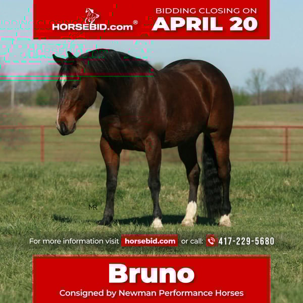 ⚜️𝐭𝐡𝐞 𝓔𝓵𝓲𝓽𝓮 𝐒𝐩𝐫𝐢𝐧𝐠 𝐂𝐥𝐚𝐬𝐬𝐢𝐜⚜️ Happening now thru MONDAY | APRIL 20th - Available EXCLUSIVELY on HorseBid's website! For more details and to register visit: www.Horsebid.com CONSIGNOR CONTACT: Newman Performance Horses 417-229-5680 LOCATION: Verona, MO BREED: AQHA & APHA REGISTERED: Yes REGISTERED NAME: CORRECTIVE ACTION COLOR: Bay HEIGHT: 14.2 AGE: 4 GENDER: Gelding Let’s talk about Bruno! He is a 4 year old bay gelding standing 14.2 and has the sweetest personality! Bruno is double registered with AQHA & APHA he is an own son of BADBOONARISING who needs no introduction! He is absolutely gentle every day you saddle him even after time off and always shows up with a willing eager attitude. Bruno is also a beautiful mover, easy jog, beautiful exited trot and slow easy lope. This horse is all class. He has good spins and is an easy stopper! We have also used Bruno to gather, ship, and doctor sick cattle, he’s extremely handy to have around if there is a job to be done! We have also pen roped on him, and Bruno shows major promise in any direction. An all-around prospect with plenty of talent, feel, and natural ability.