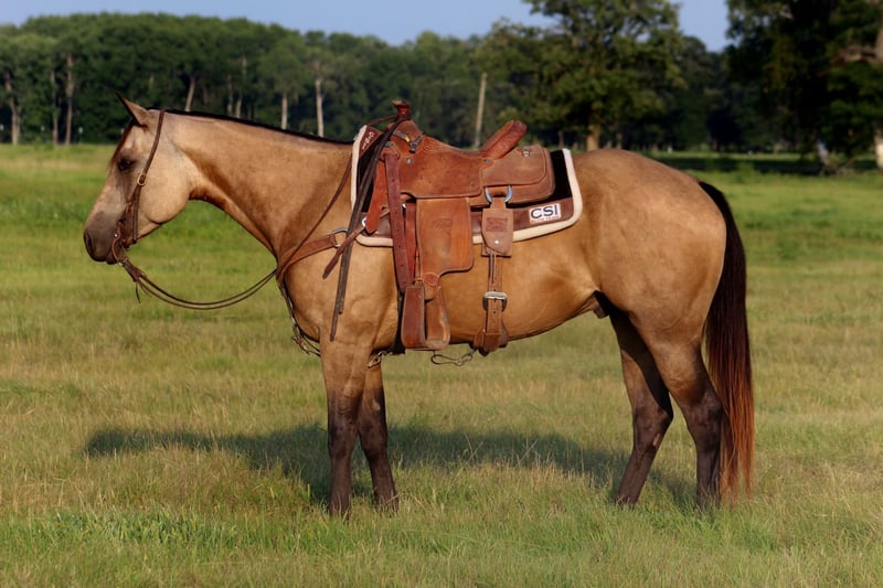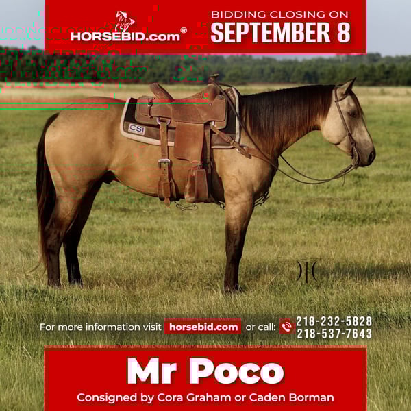 ♦️ 𝐭𝐡𝐞 𝐒𝐞𝐩𝐭𝐞𝐦𝐛𝐞𝐫 𝑺𝒆𝒍𝒆𝒄𝒕 ♦️ Happening now thru MONDAY | SEPTEMBER 8th - Available EXCLUSIVELY on HorseBid's website! For more details and to register visit: www.Horsebid.com CONSIGNOR CONTACT: Cora Graham or Caden Borman 218-232-5828 218-537-7643 LOCATION: Backus, MN BREED: AQHA REGISTERED: Yes REGISTERED NAME: Kinda Cool Blackburn COLOR: Buckskin HEIGHT: 14.3 AGE: 4 GENDER: Gelding Mr Poco is an absolute gorgeous 2021 registered buckskin gelding that is extremely gentle and has a great build. Standing a solid and balanced 15 hands, he is the perfect size for both youth and adults. His soft kind eyes and great demeanor is what makes him stand out from others. He's not just a horse; he's a partner, a confidant, and a steadfast companion ready to take on any adventure you can dream up. He’s light in the bridle, rides off your seat and legs, and responds with softness and willingness. Mr Poco makes it easy for his rider to look good, and his training sets him apart as a mount capable of excelling in the show pen or stepping into any performance direction. He is extremely safe from trail riding alone to trail riding with others he is the same horse every time. He walks through water, over logs/trees, under tunnels or around traffic and four wheelers with ease. He would truly shine in ranch versatility events, trail classes, 4H shows, or simply as a dependable partner for everyday riding. Whether you’re a competitive rider looking for a fun and capable show horse or a family needing a reliable, gentle gelding, Mr Poco is your guy! He has been exposed to all of the ranching, western, and wild side of things, from roping in the arena to calmly walking on the trails this horse will be your go too. He has great run and rate on a cow, can take one down the fence or come out of the box. Can't say enough great things about this horse, he is ready for his forever family. Located in Backus MN