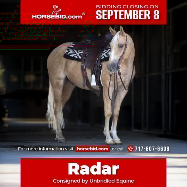 ♦️ 𝐭𝐡𝐞 𝐒𝐞𝐩𝐭𝐞𝐦𝐛𝐞𝐫 𝑺𝒆𝒍𝒆𝒄𝒕 ♦️ Happening now thru MONDAY | SEPTEMBER 8th - Available EXCLUSIVELY on HorseBid's website! For more details and to register visit: www.Horsebid.com CONSIGNOR CONTACT: Unbridled Equine 717-607-6608 LOCATION: Millerstown, PA BREED: Quarter Horse REGISTERED: Yes REGISTERED NAME: Buckwheat Peppyradar COLOR: Palomino Roan HEIGHT: 14.3 AGE: 4 GENDER: Gelding Standing at 14.3 hands, Radar is a gorgeous, Palomino Roan, registered QH gelding. 4 yrs old with unique coloring. He has a very quiet demeanor on the ground and under saddle. Great ground manners! Ground ties, great for the farrier, and is used to kids, dogs, and all kinds of commotion around. Radar is just a gentleman in every way. He sidepasses to the mounting block, stands to mount, and has a slow, smooth walk, jog, and lope, in the arena. He has a lot of buttons. He will sidepass, move hips/shoulders, and stops beautifully. Radar is good with obstacles, such as bridges, creeks, tarps, etc. He is a PHENOMENAL trail horse! Steady and rides well with other horses. He is also ridden regularly on the road and is fine with traffic, tractors, scooters, and equipment. Radar is willing to please and goes where you ask him to, therefore being a great mount for any level rider. He is up to date on vaccines, coggins, and had his teeth done this year. If any one is looking for a VERY quiet, sweet gelding, contact Maria at 717-607-6608. You are welcome to come and visit us on our farm in Millerstown, Pa. We would love to meet you!