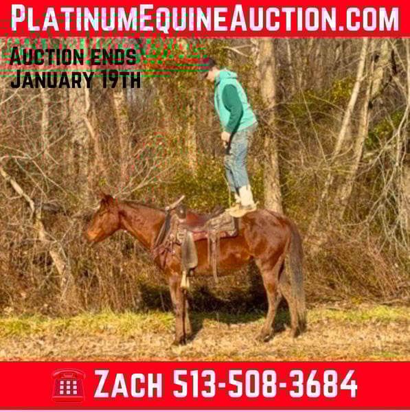 ONLINE AUCTION Place your bids at www.PlatinumEquineAuction.com Starting Bid $3500 Auction ends January 19th, 2025 Need a new saddle? Check out White Rock Saddles on our website or Facebook! Raspberry is a gorgeous chestnut roan quarter horse mare that is 3 years old stands 14.3 hands tall. I got Raspberry off the farm she was born, raised and trained on, which is a very close friend of mine that was doing some cut backs. Raspberry has been professionally trained and handled since birth. She has been rode by riders of all ages and has already proven herself trustworthy and a confidence booster. This is one incredibly kind hearted animal. Raspberry gets along with other livestock and is very easy to handle. Previously to doing the video, Raspberry handnt been rode in 2.5 weeks due to rain and as you’ll see it was no problem. She is so incredibly easy to work with. She she walks on a loose rein, has a smooth jog and And a canter that’s easy to sit, she neck reins, backs up and will even ride with bridle-less. This mare is great on the trail and is traffic safe. She rides out alone or in big groups. Yes I know she’s just 3 years old but come see for yourself, she’s truly better than most 15-20 year old horses. Located in Moscow, OH. Contact Brandenburg Stables Zach 513-508-3684 with any questions. ONLINE AUCTION Place your bids at www.PlatinumEquineAuction.com Starting Bid $3500 Auction ends January 19th, 2025 Need a new saddle? Check out White Rock Saddles on our website or Facebook!