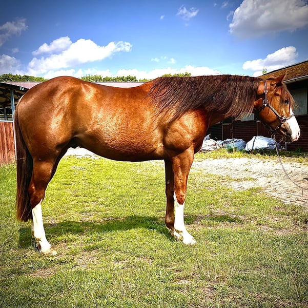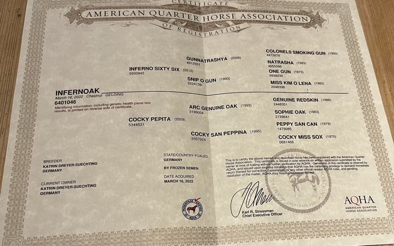 ❗️OFFERED FOR YOUR CONSIDERATION❗️ ⭐️Inferno⭐️ Inferno ist ein 2022 geborener Quarter Horse Wallach. Er ist gut Grundausgebildet mit bereits fortgeschrittenen Reiningmanövern und befindet sich auf dem Wege ein vielversprechendes Showpferd zu werden. Inferno deckt auch große Reiter sehr gut ab, er ist überaus lieb im Umgang und verlade-sowie schmiedefromm. Als ausdrucksstarkes Pferd mit dem besonderem Look, auffälliger Blesse, toller Farbe und viel Behang ist er immer ein Blickfang. Inferno ist NRHA Germany und European nominated. Dam: Cocky Pepita Ist von Arc Genuine Oak und wurde Reining geshowt, ihre Nachzucht läuft Erfolgreich. Sire: INFERNO SIXTYSIX LTE: over 220.000$ PE: over 5.000.000 $ Bei Interesse dürfen Sie uns gerne kontaktieren. 0173/7164511 0171/6840395 Standort: 31595 Steyerberg