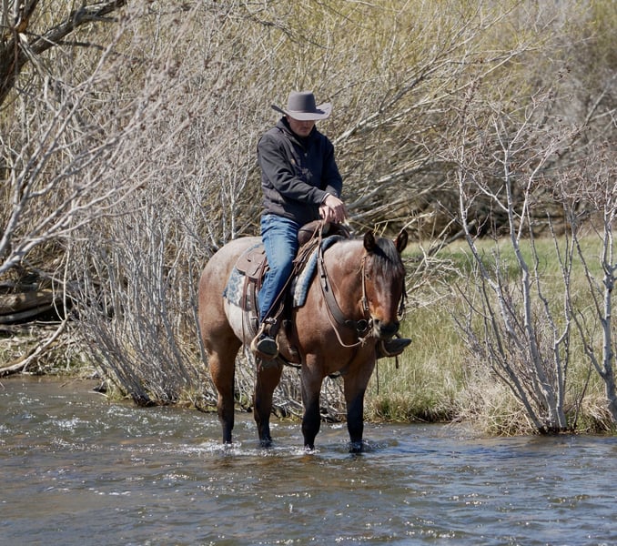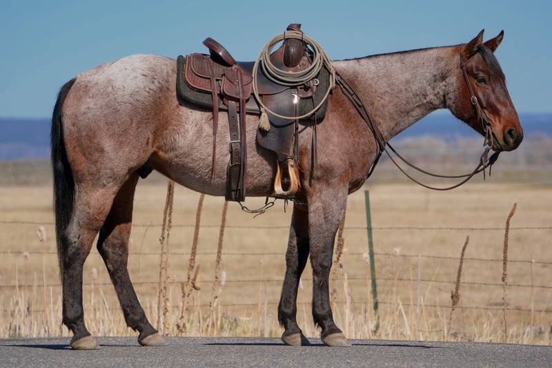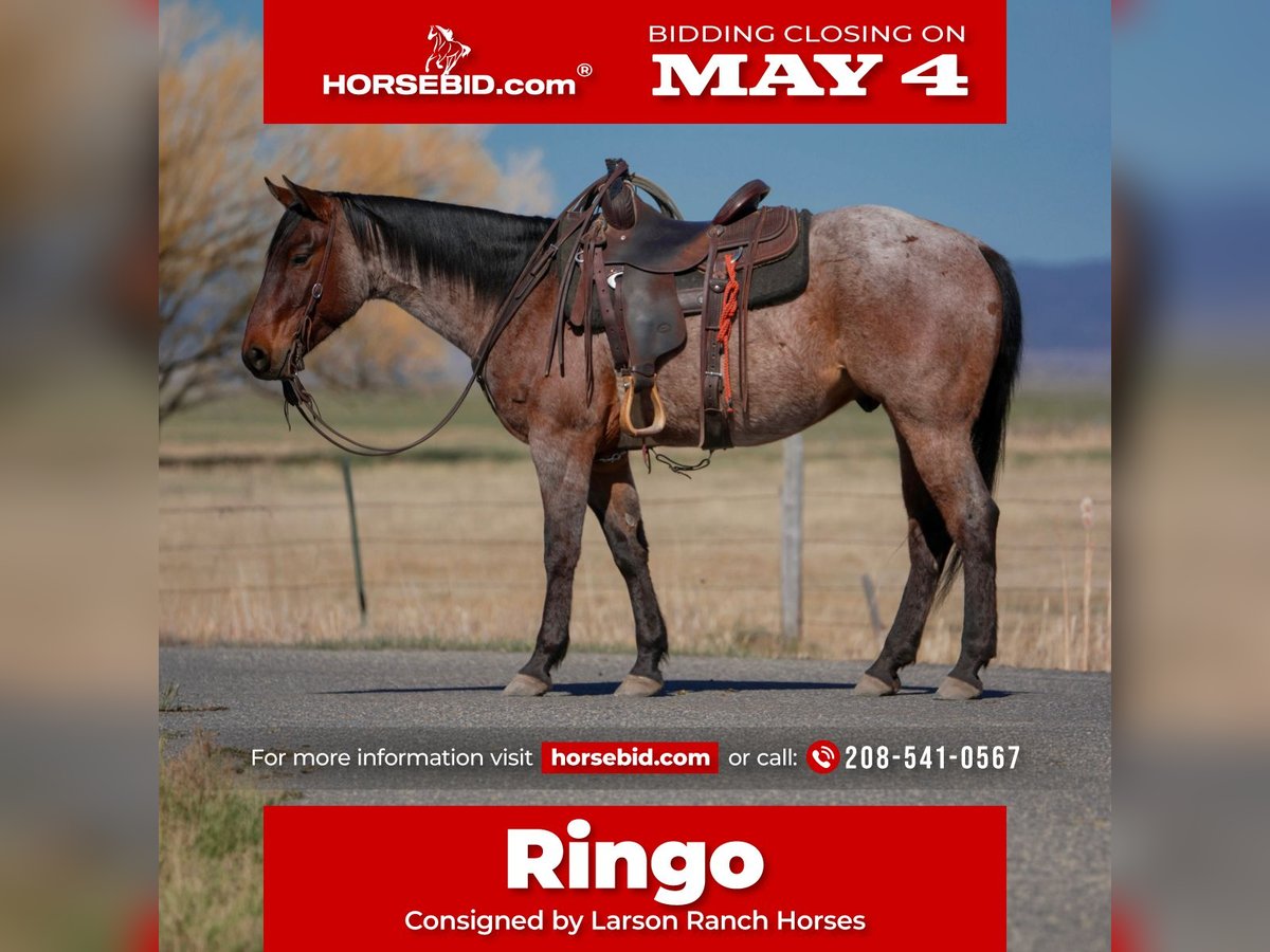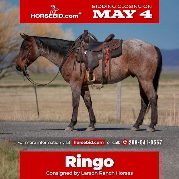 ▪️▫️◾️𝐭𝐡𝐞 𝑴𝒂𝒚 𝐒𝐞𝐥𝐞𝐜𝐭◾️▫️▪️ Happening now thru MONDAY | MAY 4th - Available EXCLUSIVELY on HorseBid's website! For more details and to register visit: www.Horsebid.com CONSIGNOR CONTACT: Larson Ranch Horses 208-541-0567 LOCATION: St. Anthony, ID BREED: AQHA REGISTERED: Yes REGISTERED NAME: LEROYS ROAN ROOSTER COLOR: Bay Roan HEIGHT: 15 AGE: 4 GENDER: Gelding Ringo is a super gentle and friendly AQHA bay roan gelding that sticks out in any crowd. He has all the charisma, charm, and characteristics that one could hope to find in a partner and friend. His quiet demeanor and beautiful build sets him apart from all the others. He's 4, but rides better than most geldings 3 times his age. He stands 15hh is kind, easy on the eyes, and a joy to be around. Ringo is no stranger to work and has been used in many different environments. He's great in the mountains and desert crossing and covering rugged country. He maneuvers his way around rocks, logs, brush, water, bogs, and other obstacles, all with ease. Ringo is really soft in all his body parts including the head and neck, and shoulders, ribs, and hind quarters making him a pretty mover in the arena ready for someone to make him their next eventing prospect. Ringo rides collects up nicely, picks up his leads and stops all on a loose rein. He's starting to spin, and when he moves, he moves effortlessly with ease and confidence. Ringo is a gentleman on the ground and comes with great manners making him safe for little ones to be around. He's so kind and respectful without being overbearing. He always aims to please and listen. Ringo has been started out of the box roping the dummy. He loves his job, wants to stop, and is strong from the horn. On the ranch he's been exposed to all of the daily chores of branding, gathering cows, sorting pairs, doctoring etc.. Ringo has been desensitized to cars and atvs, whips, tarps, noodles, flags, plastic bags, ropes, etc... If you're riding him in the arena as a queening horse or your next ranch event prospect, he’ll help capture the attention and emotions of the crowd. If you’re goal is to gather the respect of cowboys on the ranch, or showing off your new trail horse Ringo is a definite stand out that any ranch or owner would be fortunate to have. Please feel free to call if any questions. 208-541-0567 MULTIPLE REFERENCES & TESTIMONIALS AVAILABLE