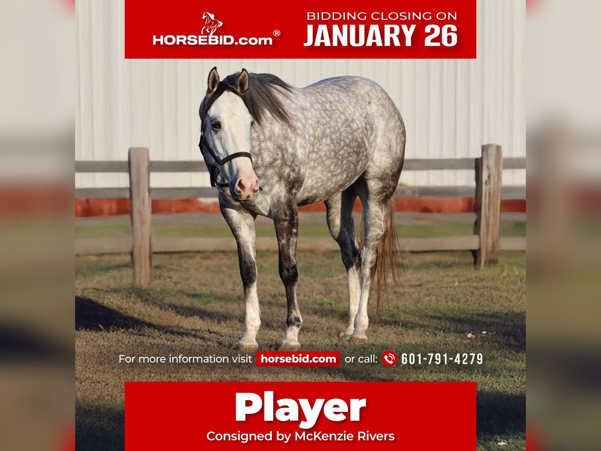𝐉𝐀𝐍𝐔𝐀𝐑𝐘 ⭐️𝑨𝒍𝒍 𝑺𝒕𝒂𝒓 𝑳𝒊𝒏𝒆𝒖𝒑⭐️ Happening now thru MONDAY | JANUARY 26th - Available EXCLUSIVELY on HorseBid's website! For more details and to register visit: www.Horsebid.com CONSIGNOR CONTACT: McKenzie Rivers 601-791-4279 LOCATION: Lucedale, MS BREED: Quarter horse REGISTERED: Yes REGISTERED NAME: Epoch COLOR: Grey HEIGHT: 15.1 AGE: 4 GENDER: Gelding Player is a beautiful 4-year-old grey gelding with a solid, correct foundation and the kind of mind everyone looks for in a young horse. He was started correctly as a long two-year-old and has been brought along patiently with consistency.He has carried the flag, and been hauled to a couple other arenas, giving him confidence away from home. Player has been lightly introduced around the barrels, showing willingness without being pushed, making him a great prospect for speed events, ranch work, or any performance direction. He is broke nicely in the face, and has a good stop, responding well to leg and rein pressure.This gelding has a great attitude, and is easy to handle.He has the age, and foundation to be finished exactly how you want. Whether you’re looking for a performance prospect, a ranch or all-around horse, or a young gelding to put your own program on, Player is ready to go in any direction.