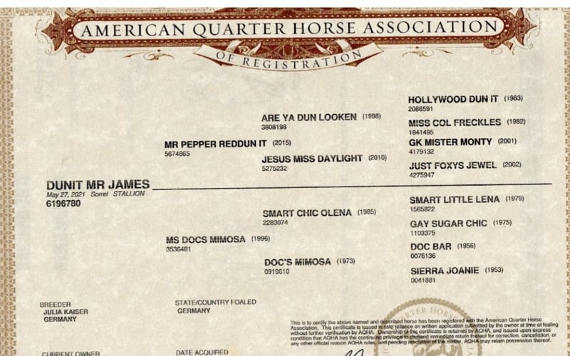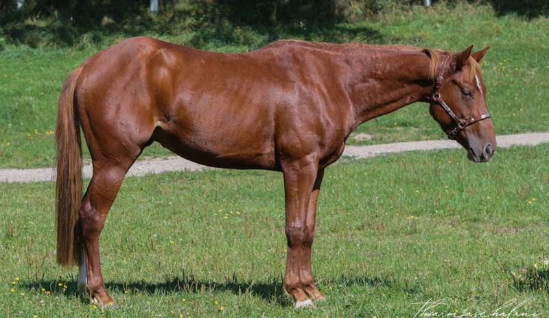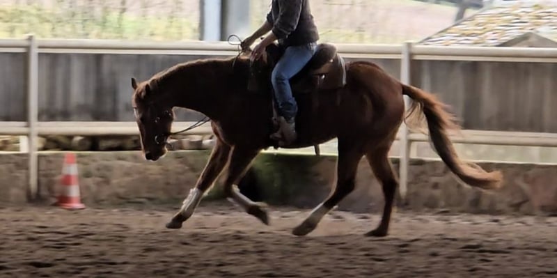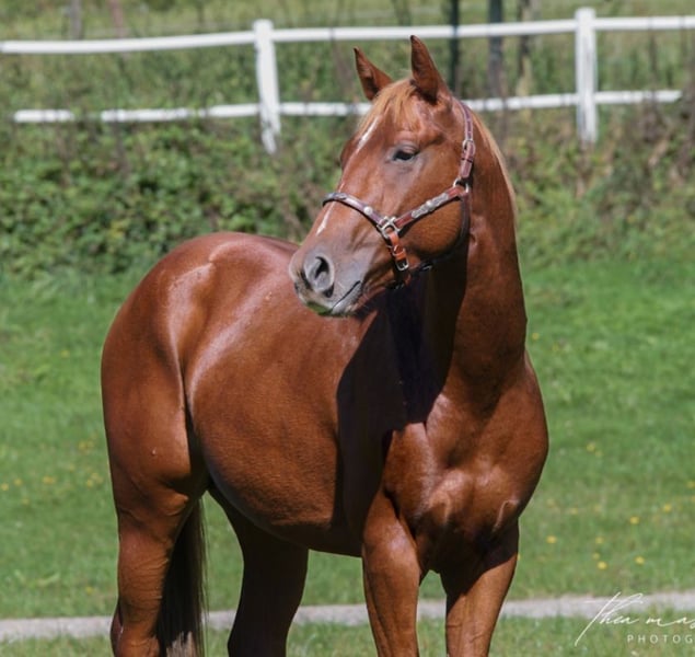 "Dunit Mr James" is a wonderfully lovable Quarter Horse gelding with an excellent basic education and an outstanding pedigree. On his sire’s side, he is a great-grandson of the legendary Hollywood Dunit, and on his dam’s side, he is a grandson of Smart Chic Olena! His sire is a multiple German champion in various disciplines and also possesses a fantastic temperament. "James" has been gently backed and has received professional basic training, including solid reining maneuvers. He always strives to do everything right and has a calm, affectionate character – he’s simply a horse you can’t help but love! He is very eager to learn and is familiar with indoor arena, outdoor riding area, and trail riding, as well as groundwork. James has a good conformation and healthy, strong hooves. He impresses with his movement and is comfortable to ride. He was raised in an open stable and currently still resides there, and he is in excellent health. A recent veterinary exam (AKU) is available, with no findings. James is ideal for someone looking for a young horse with great potential for competition or as a family horse. He can also be sold with a suitable saddle. If everything fits, the price is negotiable. For serious inquiries, we look forward to hearing from you! :)