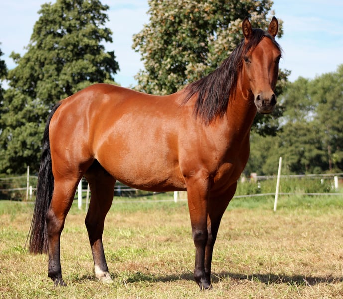 Vendo caballo de raza American Quarter Horse, potrillo, nacido en 2021, de color marrón elegante. Con una altura de aproximadamente 150 cm, es perfecto para uso recreativo. El Quarter Horse es conocido por su versatilidad, su carácter tranquilo y su buena disposición para montar. Está bien entrenado, es amigable y también adecuado para jinetes principiantes. Ideal para quienes buscan un caballo de ocio versátil y bien montado. Aún no ha sido montado en campo. Quin solo puede ser utilizado para actividades recreativas, ya que presenta un diagnóstico (más información a petición). En ningún momento ha estado cojo con nosotros. Actualmente, Quin vive 24 horas en paddock, pero también está acostumbrado a estar en box. Actualmente comparte establo con un potro de 2 años. Lleva herraduras en las patas delanteras.
