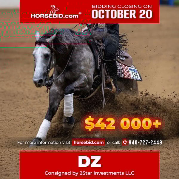 ♦️ 𝐭𝐡𝐞 𝐀𝐌𝐄𝐑𝐈𝐂𝐀𝐍 𝓕𝓪𝓵𝓵 𝓒𝓵𝓪𝓼𝓼𝓲𝓬 ♦️ Happening now thru MONDAY | OCTOBER 20th - Available EXCLUSIVELY on HorseBid's website! For more details and to register visit: www.Horsebid.com CONSIGNOR CONTACT: 2Star Investments LLC 940-727-2449 LOCATION: Whitesboro TX BREED: Quarter Horses REGISTERED: Yes REGISTERED NAME: Diamond Handz COLOR: Gray HEIGHT: 14.2 AGE: 5 GENDER: Gelding This is a very special gelding that we have owned and trained since he was a yearling. Our daughter at the age of 14 was not only the NRHA Futurity youth Reserve Champion but also finished 7th in the NRHA level 4 NonPro Futurity which is the highest level in NRHA NonPro competition. As a four year old he finished 6th at the National Reining Breeders Classic in the level 4 NonPro division competing against 5,6, and 7 year old horses. He also won the level 4 NonPro go round at the National Reining Breeders Classic this year. At the end of August at the 100X Non Pro Derby he marked a 219 which was his last time in the show pen. To date he has accumulated over $42,000 in NRHA lifetime earnings. You will always be on one of the flashiest horses at the show with this fancy dappled gray gelding. He has a big thick mane and tail. He is a very easy keeper and is very sound and requires no maintenance. Whether you continue to show him at the major reining events or move in a different direction with him, you will find he is an extremely broke horse that tries his heart out. We wish that we could keep them all, but unfortunately we can't, so we hope you enjoy him as much as we have.