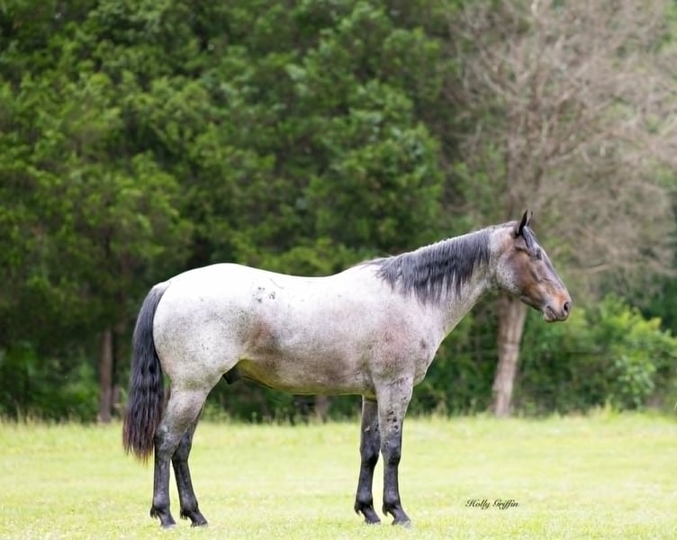 ONLINE AUCTION Place your bids at www.PlatinumEquineAuction.com Starting Bid $3500 Auction ends June 29th, 2025 Need a new saddle? Check out White Rock Saddles on our website or Facebook! If you’re looking for your next lifelong partner look no further!! They dont make many like this gelding! Meet Blue! He is as honest and loyal as the day is long! I can honestly say that anyone can ride this horse from beginners to advanced riders, he is uncomplicated to ride and safe safe safe! Blue is a registered AQHA 2021 model, Blue Roan gelding that stands 14.2-14.3 hands tall and he is stocky built. He has enough buttons for the advanced riders and will go as slow and easy for the beginners as he is very forgiving and wants to ride quiet! Blue has a very nice walk, trot and lope, picking up both leads with ease. He has a nice one hand neck rein with a nice turn around. You can side pass him, open the gates or any obstacle you may encounter. He is broke enough to ride with or without your bridal as seen in the videos. We have trail rode this horse all around Kentucky and overnight camping. He handles all situations with ease. He will ride across anything you point him at including logs, water, creeks and rough terrain. He loads and hauls with ease. He’s been ridden around farm animals, dogs and up and down the road! Blue can be caught anywhere you find him standing! He truly loves people and wants to be loved on! He tacks up very easy and loves to be groomed and bathed! He Shoes very easy on all 4 feet. This horse will pasture well with others or by himself in or out of a stall. Blue never gets fresh with time off, or any silly business at all. No need for lunging! Saddle him up and hop right on. We ride both our kids on him at the barn and out on the trails. This is the best gelding I’ve had the privilege of owning in a long time and will probably regret selling him. Blue has always been sound and has no issues but we are open to PPE at buyers expense. Blue has NO vices! Call Holly Griffin at 270-543-0310 if you have any questions or would like to come see Blue in person in Greenville, KY! We can always Facetime call so you can see him in live time and can get any additonal videos that are requsted. Thanks! ONLINE AUCTION Place your bids at www.PlatinumEquineAuction.com Starting Bid $3500 Auction ends June 29th, 2025 Need a new saddle? Check out White Rock Saddles on our website or Facebook!