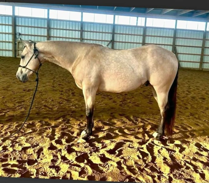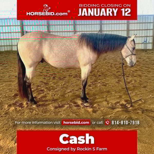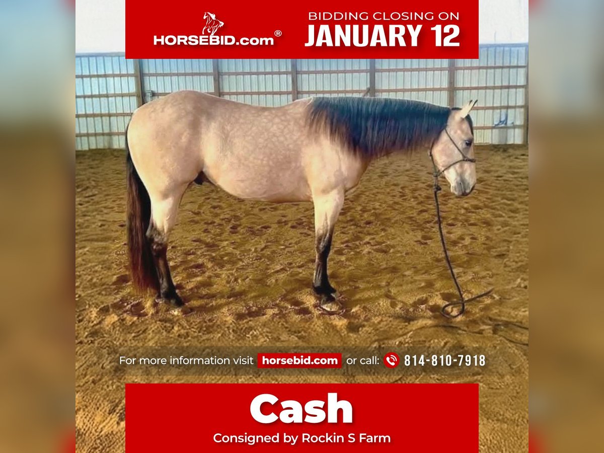 ♦️𝐍𝐄𝐖 𝐘𝐄𝐀𝐑'𝐒 𝑬𝒙𝒕𝒓𝒂𝒗𝒂𝒈𝒂𝒏𝒛𝒂♦️ Happening now thru MONDAY | JANUARY 12th - Available EXCLUSIVELY on HorseBid's website! For more details and to register visit: www.Horsebid.com CONSIGNOR CONTACT: Rockin S Farm 814-810-7918 LOCATION: Rebersburg, PA BREED: Quarter Horse REGISTERED: Yes REGISTERED NAME: Cash COLOR: Buckskin HEIGHT: 14.3 AGE: 5 GENDER: Gelding 💥💥 Cash 💥💥 Registered AQHA Here's a cool dude! Cash is the type that always aims to please you and willing to learn new things! Cash is a coming 5yr old cool Cowboy Cadillac gelding. He will try whatever is asked of him. Has a great foundation. WTC, sidepass and change leads both directions. You can move his hip and shoulder independently. Crosses water and elevated bridges. He's been to the big woods on trail rides and negotiated every obstacle that we encountered, calmly. He is young but shows great potential to be a faithful partner. He is an easy keeper, turned out with mares and geldings on a round bale. Good for the farrier, vet, and does what is asked of him. Super smooth Jog and a good long trot. He has unlimited potential as a RR or serious trail mount. We've used him to check fences and pushed cows on him here at the farm as well as taken him to state parks on trail rides, he loads and unloads with ease, he hauls great Cash also rides great in the arena and has been ridden by both adults and children even some timid riders and is always the same horse even with time off, Cash is gentle and safe and we think most anyone can get along with this guy whether you want a trail partner or if you're looking to build your next rope horse or even a lesson program! Cash is healthy and 100% sound, he has a current coggins and health certificate and is up-to-date on farrier and dewormer We are happy to assist in arranging transportation anywhere in the US Please feel free to call Sam 814-810-7918 with any questions