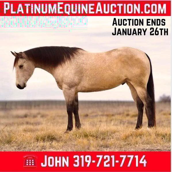 ONLINE AUCTION Place your bids at www.PlatinumEquineAuction.com Starting Bid $3500 Auction ends January 26th, 2025 Need a new saddle? Check out White Rock Saddles on our website or Facebook! Adrifty Smokin Vegas is a stunning 5 year old 15.3-hand buttermilk buckskin gelding weighing 1,400 pounds and standing out as an exceptional ranch prospect. Vegas has excellent bloodlines including Mr Jess Perry and Smokin Blackburn. Versatile and well-trained, he’s been used for a variety of jobs, from roping the hot heels and roping mule. Vegas has been on hundreds of miles of trails including Palo Duro Canyon, the Canadian Red River and Matzel Game Reserve multiple times. Vegas has been a trusted part of a lesson program, working with children & adults of varying skill levels. He is traffic safe and used to farm machinery including tractors & skid loaders. He is safe around dogs, cattle, and all other types of animals. We have used him to break colts to lead and pony our older contestant horses. Vegas has been patterned on the barrels and shown in 4H. He excels in trail competition and obstacles. Vegas has outstanding ground manners & is easy to catch, gets along well with other horses and ponies. and thrives on attention. Stands like a statue for the farrier, cross ties, bathes and clips perfectly. He will load in any size trailer from a 2 horse to a stock trailer. Vegas has had the best care including vaccinations, teeth, and worming. He has no allergies or bad habits. He is good in a stall or a pasture. Vegas is very willing to learn new job skills and is very talented. Vegas is very kind he has never offered to buck, kick, strike or bite ever. 100% sound in mind, body, and spirit, making him a reliable and well-rounded partner for any family. For further details or videos of this beautiful gelding, contact John McPhail 319-721-7714.