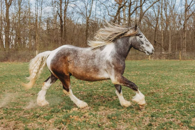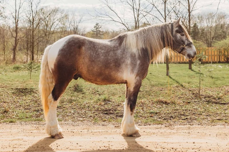 ONLINE AUCTION Place your bids at www.PlatinumEquineAuction.com Starting Bid $3500 Auction ends May 25th, 2025 Need a new saddle? Check out White Rock Saddles on our website or Facebook! Meet Blackstone’s Big John! John is a 17.1hh uniquely colored rose grey and white painted Drum horse gelding. (Percheron, Spotted draft, Gypsy Vanner X) He is as gentle as a lamb. His mane and tail are very thick and natural wavey and he has beautiful feathering on all 4 legs. John is 4 years old. He’s big, he’s pretty, and best of all he’s quiet! John has a beautiful typey face and a kind and expressive eye. He’s the type of horse who wants to be your friend. John is so much like an over grown puppy dog he will follow you all over the pasture and even come trotting up when called. He truly is a best friend type of horse! Anyone can groom lead and handle him on the ground. He is also very easy to catch outside and plays well with other horses. John is nice and quiet under saddle. He works quietly in all gaits with his ears up while being relaxed and happy. He walk trot canters knows his leads and moves on and off your seat and leg. He is alert but shows calm and capable confidence in everything you ask of him! He has extensive trail miles and will go any direction you point him. He’s been down the roads and swam with the kayak’s. John also has some light mileage over fences and he’s bold and brave to any obstacle inside or out. You do not have to have a good eye to get this boy around!! He’s not reactive to new fences facilities or various types of fill. He has been ridden up and down the back roads of Michigan’s beautiful hunt country and would excel in fox hunting. Overall John is a laid back ride but he will move thru the paces off of your voice. He has been hauled to various parks and schooling shows and is very level headed in new places! John is also broke to drive and will work happily in a team or alone. He’s an all around boy that’s got a unique look and is a true a joy to have in the barn. Serious inquiry’s and a loving home only! Big John is located in Howell, MI 48855 give Ellesse Schwartz a call or text 248-390-6831 for more information. ONLINE AUCTION Place your bids at www.PlatinumEquineAuction.com Starting Bid $3500 Auction ends May 25th, 2025 Need a new saddle? Check out White Rock Saddles on our website or Facebook!