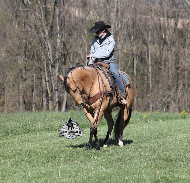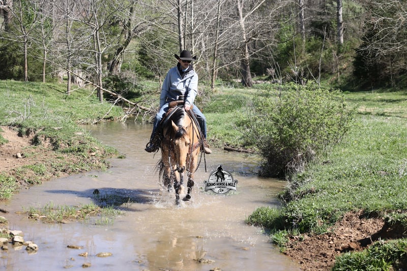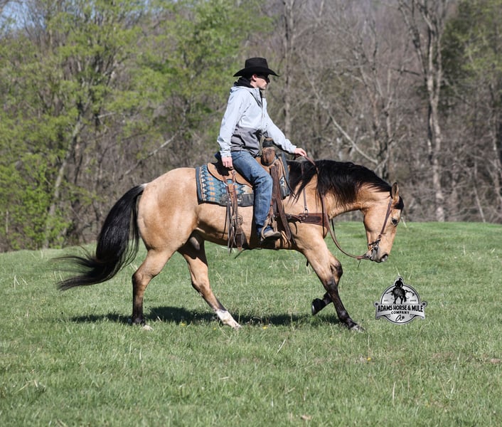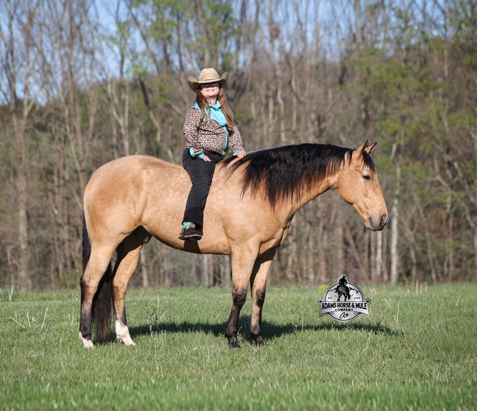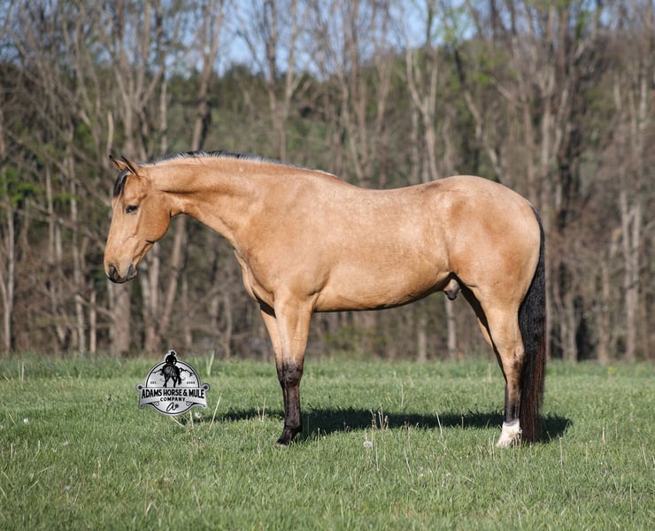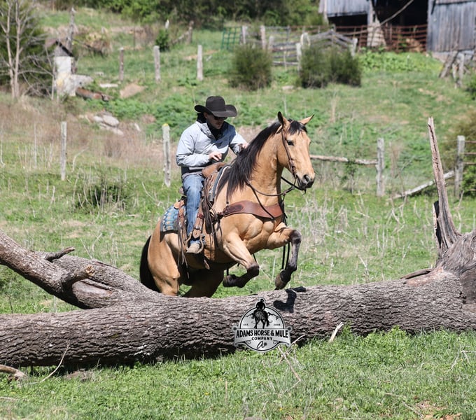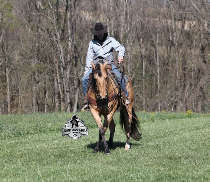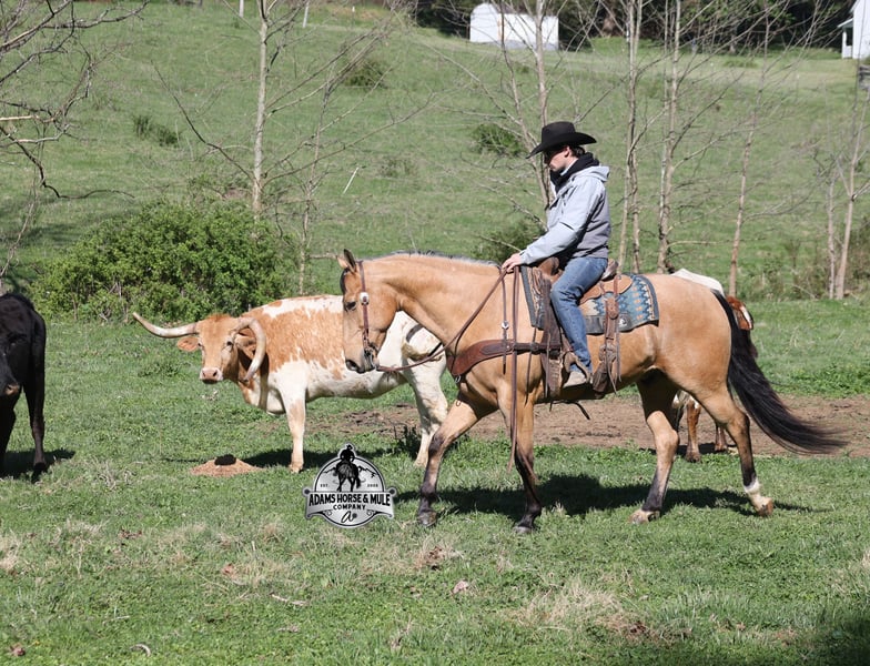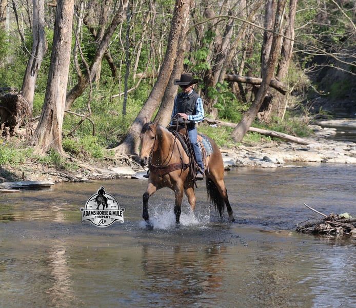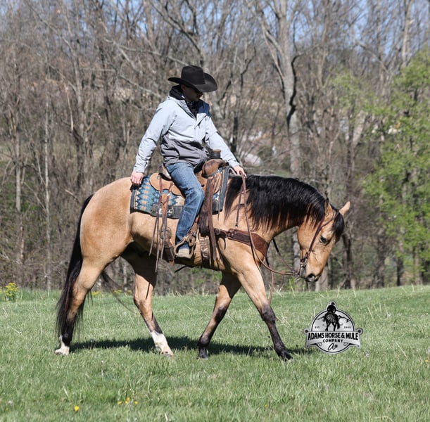 Go to visit our website for more pics and video link at www.AdamsHorseAndMuleCo.com AHAMC has been in the horse business and sold horses over the internet since 2005. We have a long track record of success with hundreds of happy customers. We work hard to match riders with the correct horses and specialize in beginner safe, family friendly horses that have been used and checked out by our family! We can set up transportation anywhere in the US and look forward to working with you. Gunsmoke, Bonanza, even more recent Spirit… all these shows had buckskins in them and there is no color more iconic or more American than a Buckskin!!! This buckskin beauty named Trashy Jak Peppy is an amazing 15.2hh, 2021 model, AQHA Reg, G-O-L-D-E-N Buckskin, gelding that looks great and rides great too! Peppy is stout enough to carry a bigger sized rider and gentle enough to carry the little ones as well! He is a horse that will adapt to his rider to meet their needs as he is super smart and very forgiving! He is safe for the whole family and guests. Peppy has been used out on the ranch in all aspect of ranch work. From roping and doctoring to sorting, he has plenty of cow sense. He has been ridden around Rodeo venues, sorted and loaded the bulls. Lights, the announcers, crowd roaring… nothing phases him! Peppy trails the roping dummy and is ready to start out of the box. Peppy has had reining training and is totally user friendly to ride as he lopes slow circles, with his head and the reins draped, it is poetry in motion. He spins circles correctly both ways and slide stops… he has the moves to go along with the good looks! If the ranch work is done and you just want to go for a relaxing trail ride… steep slopes, rocky terrain, creeks, logs, ditches… he crosses it all with ease and is never in a hurry! He will take care of a beginner is tough situations and get them back safely. Peppy has been ridden around town, through the bank drive thru, ridden on the highways even at night and is totally traffic safe. Whether you ride him daily, or leave him off over the winter, he is still the same loveable gentle horse, absolutely no meanness to this guy! Pedigree, Training, Experience, Versatility, Safety… his profile is complete and he is looking for his soul mate!!! Call Eric with any questions 606-308-2461.