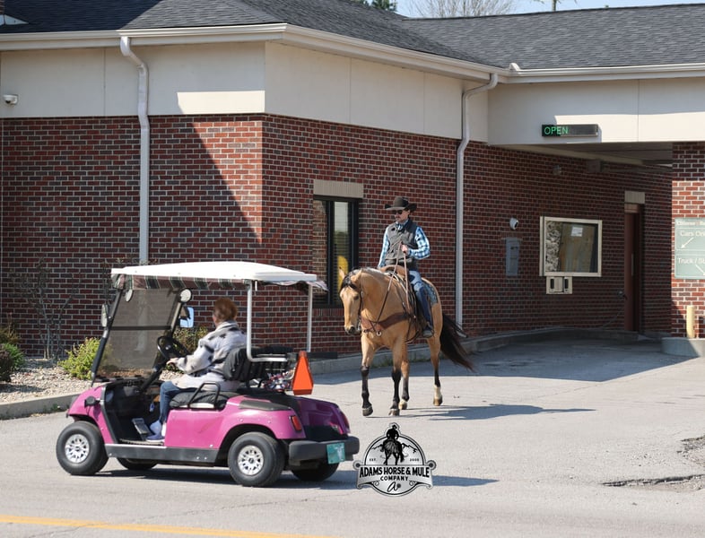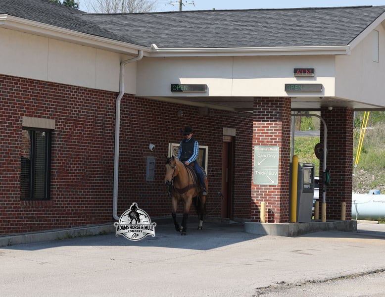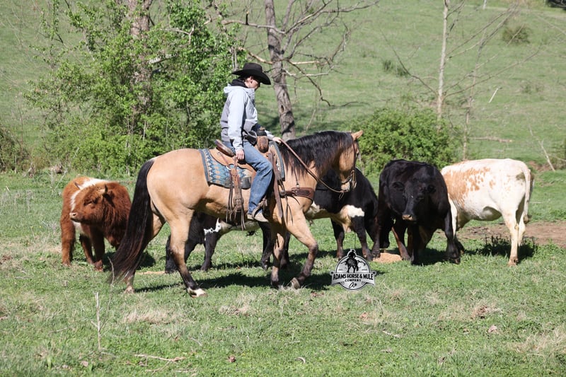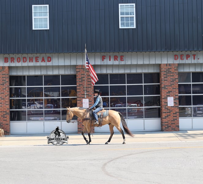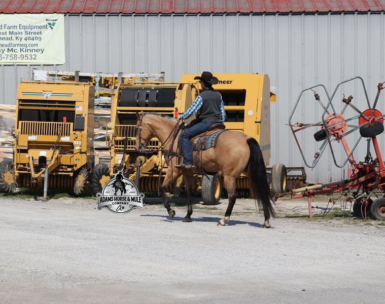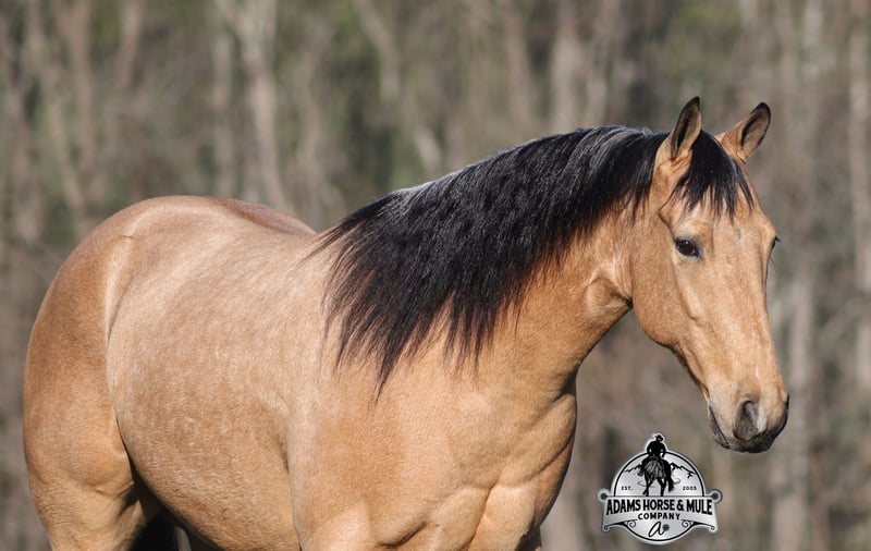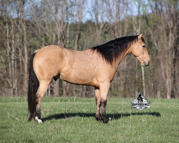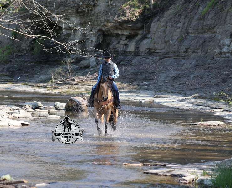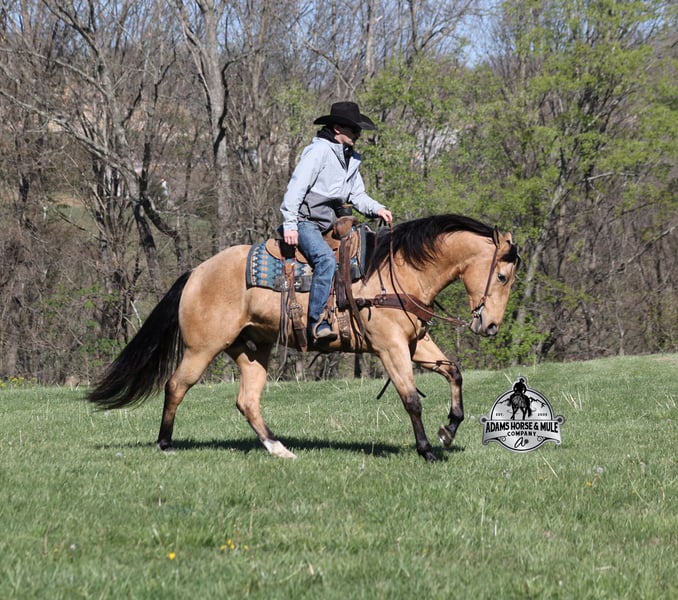 Go to visit our website for more pics and video link at www.AdamsHorseAndMuleCo.com AHAMC has been in the horse business and sold horses over the internet since 2005. We have a long track record of success with hundreds of happy customers. We work hard to match riders with the correct horses and specialize in beginner safe, family friendly horses that have been used and checked out by our family! We can set up transportation anywhere in the US and look forward to working with you. Gunsmoke, Bonanza, even more recent Spirit… all these shows had buckskins in them and there is no color more iconic or more American than a Buckskin!!! This buckskin beauty named Trashy Jak Peppy is an amazing 15.2hh, 2021 model, AQHA Reg, G-O-L-D-E-N Buckskin, gelding that looks great and rides great too! Peppy is stout enough to carry a bigger sized rider and gentle enough to carry the little ones as well! He is a horse that will adapt to his rider to meet their needs as he is super smart and very forgiving! He is safe for the whole family and guests. Peppy has been used out on the ranch in all aspect of ranch work. From roping and doctoring to sorting, he has plenty of cow sense. He has been ridden around Rodeo venues, sorted and loaded the bulls. Lights, the announcers, crowd roaring… nothing phases him! Peppy trails the roping dummy and is ready to start out of the box. Peppy has had reining training and is totally user friendly to ride as he lopes slow circles, with his head and the reins draped, it is poetry in motion. He spins circles correctly both ways and slide stops… he has the moves to go along with the good looks! If the ranch work is done and you just want to go for a relaxing trail ride… steep slopes, rocky terrain, creeks, logs, ditches… he crosses it all with ease and is never in a hurry! He will take care of a beginner is tough situations and get them back safely. Peppy has been ridden around town, through the bank drive thru, ridden on the highways even at night and is totally traffic safe. Whether you ride him daily, or leave him off over the winter, he is still the same loveable gentle horse, absolutely no meanness to this guy! Pedigree, Training, Experience, Versatility, Safety… his profile is complete and he is looking for his soul mate!!! Call Eric with any questions 606-308-2461.