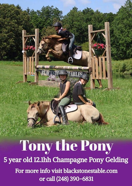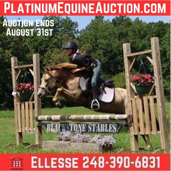 ONLINE AUCTION Place your bids at www.PlatinumEquineAuction.com Starting Bid $3500 Auction ends August 31st, 2025 Need a new saddle? Check out White Rock Saddles on our website or Facebook Stop your scrolling! Here is the ultimate safe AND talented pony with show experience and trick training! I’m proud to introduce and offer Tony The Pony! He is the pony that kids dream of owning and that parents trust to keep their kiddos safe. Tony is a unique champagne color with a beautiful thick mane and tail. He is 5 years old and stands a stout 12.1hh. Tony is a pony anybody can ride! He walk trot and canters on a loose rein, steers with leg and seat, has flying lead changes, and has excellent breaks. For the last couple months, Tony has been working in our lesson program teaching all types of riders including the first timers to the more advanced students that jump and show. Tony has attended several schooling shows! He performed well in the chaos and won a few blue ribbons! Tony also rides western! He trail rides like an old pro. Nothing phases him out in the woods. He’s seen it all from the hills, creeks, ponds, thick brush, logs, mud, and wildlife. Just when you think Tony couldn’t get any better well he is also trick trained! He knows how to sit and lay down on command. A tap on his left shoulder blade or on his left front pasture and he lays right down to get on or off. Tony has wonderful ground manners. He will ground tie, cross tie, or tie to a post and stand all day to be groomed. He also stands for other things like saddling, farrier, mounting/dismounting, bathing etc. He is also well broke to ride. Hook him up and head to town, a parade or take him sledding in a snowy day, he’s game to do it! He is a finished, safe, quiet, bombproof pony with absolutely no holes in his training! On top of that he has the talent and training to take your young rider to the top of his/her class. What more could you want in a kids pony?!?!? Come meet Tony and he’s sure to steal your heart! Located in Howell Michigan. Contact Ellesse Schwartz 248-390-6831 with any questions. ONLINE AUCTION Place your bids at www.PlatinumEquineAuction.com Starting Bid $3500 Auction ends August 31st, 2025 Need a new saddle? Check out White Rock Saddles on our website or Facebook