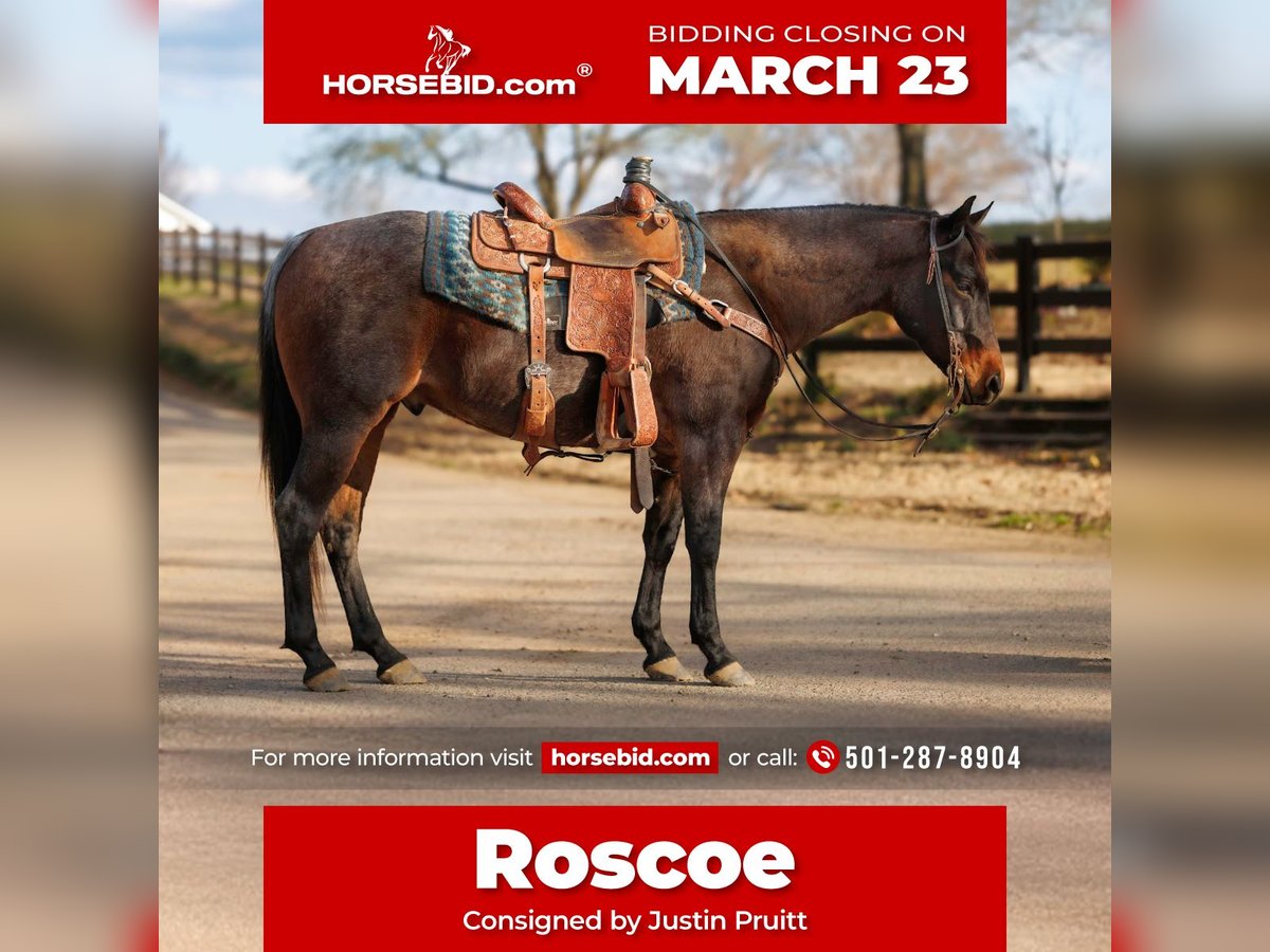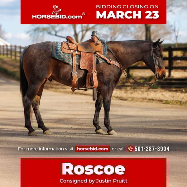 ⚜️𝓽𝓱𝓮 𝐆𝐎𝐋𝐃 𝓢𝓮𝓵𝓮𝓬𝓽⚜️ Happening now thru MONDAY | MARCH 23rd - Available EXCLUSIVELY on HorseBid's website! For more details and to register visit: www.Horsebid.com CONSIGNOR CONTACT: Justin Pruitt 501-287-8904 LOCATION: Greenbrier, AR BREED: AQHA REGISTERED: Yes REGISTERED NAME: TL Mecoms Hickory COLOR: Bay Roan HEIGHT: 14.3 AGE: 6 GENDER: Gelding TL Mecoms Hickory aka “Roscoe” is a 6-year-old bay roan gelding that is the kind the whole family can enjoy. He has a gentle, willing disposition and is safe enough for kids to ride both inside and outside of the arena. He’s the type of horse you can feel confident putting just about anyone on. Outside, Roscoe is as solid as they come. He’s been ridden extensively on the trails and is comfortable traveling through brush, crossing logs, and handling rough terrain without hesitation. He has also spent time in big, rough Montana country gathering and working cattle, proving he’s a dependable horse when there’s a job to do. As a 3-year-old, Roscoe was ridden in a sale barn and feedlot environment where he worked the back pens, giving him plenty of real-world experience around cattle and busy environments. He’s seen a lot and handles new situations with a level head. In the arena, Roscoe has been started in both the heeling and breakaway and is progressing nicely. He is ready for someone to continue hauling him and take him to jackpots in the heeling. With his experience and attitude, he has the foundation to go in several different directions depending on what you want to do with him. Roscoe is easy to be around and simple to handle. He stands quietly to wash, brush, shoe, saddle, and load in the trailer. He has been hauled to a lot of different places and travels well. If you’re looking for a versatile gelding that can go from the ranch to the arena and still be gentle enough for the family, Roscoe is the kind that’s hard to find.