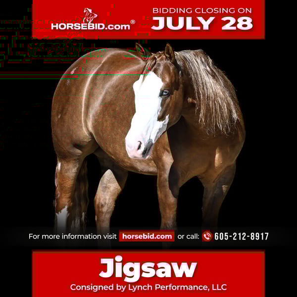 ⚔️ The HORSEMAN's Select ⚔️ Happening now thru MONDAY | JULY 28th - Available EXCLUSIVELY on HorseBid's website! For more details and to register visit: www.Horsebid.com CONSIGNOR CONTACT: Lynch Performance, LLC 605-212-8917 LOCATION: Canistota, SD BREED: AQHA APHA REGISTERED: Yes REGISTERED NAME: Dunnitwithadreamgirl COLOR: SORREL HEIGHT: 14.3 AGE: 6 GENDER: Gelding If flash is your thing, don’t look any further! Jigsaw is a jaw dropping stunning sorrel gelding with the perfect bald face, blue eyes, and four white socks. This guy is PRETTY!!!! Jigsaw has incredible shape to him and stands a stout 14.3 hh. This guy is loaded with talent and SO fun to ride! Everyone that sees him stops dead in their tracks and wants to know more. Jigsaw is a money earning reiner with $8,858.00 and we have a full list of his earnings available. This guy has aggressive, stylish spins and is a monster stopper. Jigsaw is a total powerhouse, but will absolutely slow down for his rider as well. Jigsaw will change leads with ease and has very cool fast circles. The judges definitely take a second look when this guy walks into the pen! Jigsaw is ready for his ranch riding career with his captivating presence. He really reaches out in his extended trot and maintains style and grace. The transition to slow trot is flawless and easy as he pays complete attention to your cues. Jigsaw will spin whatever speed he is asked from easy and slow to plus one in the reining pen. This incredible athlete has been used on our ranch to sort cattle as well as started in the heading and heeling. Jigsaw really cows up to one when asked. He has all the strength and ability to be both a head and heel horse. Jigsaw has a cool style coming across the pen on the head side and of course buries his hind end on the heel side. Jigsaw is safe for anyone to ride and has been trail ridden by us and our nieces. Jigsaw genuinely has an aim to please personality. He really wants to please his rider! It is no wonder this guy is so amazing with the kind of pedigree he has. Being an own son of $4.5 million sire Pale Face Dunit and out of a daughter of the legendary Magnum Chic Dream- $13 million sire! Jigsaw was born with the best conformation, demeanor, looks, and talent. Jigsaw is 100% sound and has a pre-purchase exam. There is no funny business to this guy whatsoever. We are super proud to offer him! One is not only getting a new horse when they work with us, but a partnership. We will help you out in any way we can even after you take Jigsaw home. Please check out his pictures, pedigree, and video and give us a call!