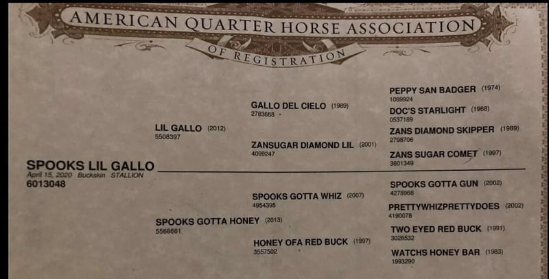 "AVAILABLE ON ONLINE HORSE AUCTION AT www DOT PlatinumEquineAuction DOT com BIDDING OPEN NOW thru SUNDAY | MARCH 22ND! *Final price will be determined on auction site* CONSIGNOR CONTACT INFO: Longhorn Ranch 831-537-1915 LOCATION: Paicines, CA Spooks Lil Gallo 2020 Buckskin Gelding • 15.1 Hands. Stout built Offered as a client consignment, Spooks Lil Gallo is a striking buckskin gelding that beautifully combines pedigree, presence, and a solid foundation. This gelding’s breeding immediately sets him apart. He is sired by Lil Gallo, a son of the legendary Gallo Del Cielo (Rooster), one of the most influential sires in the performance horse industry. Rooster offspring are widely recognized for their athleticism, trainability, cow sense, and longevity. His pedigree carries the influence of industry-defining horses including Peppy San Badger and Doc’s Starlight — cornerstone bloodlines known for producing exceptional minds, natural ability, and proven performance talent. On the bottom side, he traces to Spooks Gotta Whiz, a stallion synonymous with brilliance, style, and elite-level performance success. This powerful combination of cow horse and reining bloodlines provides Spooks Lil Gallo with the genetic foundation for versatility and unlimited potential. Beyond the papers, Spook is a horse that is easy to appreciate every day. In the arena, Spook is fluid, broke, and a pleasure to ride. He travels collected, soft, and smooth, carrying himself with balance and correctness. His transitions are quiet and relaxed, and he moves with a natural cadence that makes him both comfortable and visually appealing. He lopes off willingly, stays soft in the bridle, and responds nicely to his rider. Spook shows smooth stops and willing turnarounds, reflecting the quality of his foundation and training. His presence, movement, and overall style make him a true show stopper each time you ride. Outside the arena, Spook continues to impress. He has been hauled on numerous trail rides and handles new environments with a thoughtful, steady mindset. He is naturally curious yet cautious, taking in his surroundings with awareness and good judgment. Whether riding out alone or with company, he remains willing, manageable, and dependable. Spook is currently started on obstacles and continues to progress with a willing, honest attitude. He has been introduced to tarps, flags, balls, and various challenges. While he may show some initial sensitivity, he remains sensible and settles in with reassurance and consistency, demonstrating a trainable and responsive nature. In daily handling, Spook is exactly the type everyone hopes for. He hauls well, ties quietly, bathes easily, and stands respectfully for the farrier. He is super sweet, friendly, and genuinely enjoyable to be around, with a kind demeanor that makes him a pleasure in the barn. With his exceptional pedigree, quality movement, and versatile foundation, Spooks Lil Gallo offers opportunity in many directions. Whether your goals include trails, ranch work, performance events, or continued development, this gelding has the tools and mindset to excel. For additional information, or questions: Longhorn Ranch Dina Paicines, California 831-537-1915