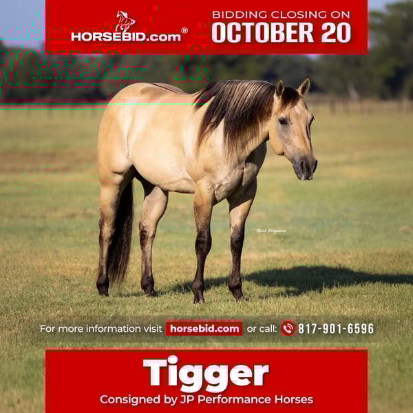 ♦️ 𝐭𝐡𝐞 𝐀𝐌𝐄𝐑𝐈𝐂𝐀𝐍 𝓕𝓪𝓵𝓵 𝓒𝓵𝓪𝓼𝓼𝓲𝓬 ♦️ Happening now thru MONDAY | OCTOBER 20th - Available EXCLUSIVELY on HorseBid's website! For more details and to register visit: www.Horsebid.com CONSIGNOR CONTACT: JP Performance Horses 817-901-6596 LOCATION: Weatherford, TX BREED: Quarter Horse REGISTERED: Yes REGISTERED NAME: Bar Poco COLOR: Buckskin HEIGHT: 15.1 AGE: 5 GENDER: Gelding 🐴 Meet Tigger – Your Forever Heart Horse Everyone dreams of that horse with the puppy-dog personality and endless talent—and Tigger is exactly that. At just 5 years old, this stunning AQHA buckskin gelding already checks every box for a true lifelong partner. Tigger is the first to meet you at the gate, love shining in his eyes, always eager for your attention. His golden coat and distinct tiger stripes on his legs make him a true standout wherever he goes. He’s been in consistent training at the ranch and continues to thrive. Whether it’s crossing water, navigating traffic, working cattle, or heading out on a long trail ride, Tigger takes everything in stride. We’ve also started him over jumps—he absolutely loves it and is confidently clearing 2 feet with ease. Tap his front feet and he’ll stretch out for you to climb on, standing quietly until you’re ready to move off. He’s calm, confident, and never spooky—safe for any level of rider. He easily picks up his leads, has a nice stop, is beginning to spin, and neck reins with just one finger. This gelding has all the right buttons to excel in AQHA Ranch Trail, Ranch Pleasure, or even English and jumping classes. The sky truly is the limit with Tigger. Tigger loads and unloads easily, stands quietly for the farrier, and even enjoys bath time! His sweet, gentle nature makes him a perfect fit for the whole family or even therapy work. Whether you ride him every day or give him a few weeks off, he’s always the same dependable, easy-going partner. Absolutely nothing phases this horse—he takes life in stride. We have given many riding lessons to beginners on him. He has the smoothest trot and lope and is very easy to ride. With his soft expression, kind eyes, and willing heart, Tigger isn’t just a horse—he’s your next best friend. ⸻ ✨ Quick Facts: • Age: 5 years old • Height: 15.1 hands • Coggins: Current • Teeth Floated: May 2025 • Temperament: Exceptionally sweet, calm, and family-safe If you’re searching for that once-in-a-lifetime horse—safe, reliable, and full of personality—Tigger is it. 📞 For more information or to schedule a visit or FaceTime call, contact Jackie with JP Performance Horses at (817) 901-6596. 🚛 Shipping can be arranged anywhere.