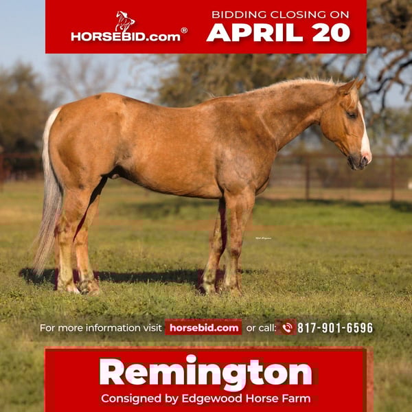 ⚜️𝐭𝐡𝐞 𝓔𝓵𝓲𝓽𝓮 𝐒𝐩𝐫𝐢𝐧𝐠 𝐂𝐥𝐚𝐬𝐬𝐢𝐜⚜️ Happening now thru MONDAY | APRIL 20th - Available EXCLUSIVELY on HorseBid's website! For more details and to register visit: www.Horsebid.com CONSIGNOR CONTACT: Edgewood Horse Farm 817-901-6596 LOCATION: Weatherford, TX BREED: Quarter Horse REGISTERED: No REGISTERED NAME: Na COLOR: Palomino HEIGHT: 15.1 AGE: 6 GENDER: Gelding 🔥 REMINGTON 🔥 ✨ Chocolate Palomino Gelding | Pretty, Broke & Versatile ✨ Remington is a stunning chocolate palomino gelding standing 15.1 hands tall and 6 years old. He is as pretty as they come, with beautiful movement and a natural way of carrying himself that makes him stand out wherever he goes. This gelding has been an absolute pleasure to ride and has the kind of foundation and ability to go in any direction you choose. He has been primarily used as a trail horse and has seen it all—bridges, steep terrain, and water crossings (which he loves!). He’s been exposed to cattle, dogs, ponies, and chickens and handles it all with ease. Remington is super stout and built to last, making him an excellent ranch horse prospect. He has a one-hand neck rein, a big stop, and is soft in the bridle, making him responsive yet easy to ride. He will ride out alone or with a group and stays consistent either way. Remington stands quietly for the farrier and has a sweet personality. If you’re looking for a top-notch trail horse that can also step into a ranch job and be your everyday partner and best friend, Remington is one you’ll want in your barn. 📍 Located in Weatherford, Texas 📞 Call/Text: 817-901-6596 🚛 Shipping can be arranged anywhere
