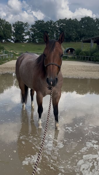 Zum Verkauf steht Hancocks Best Broany *Bruno* Ich wünsche mir für ihn ein Zuhause, in dem er seinen Bedürfnissen nach gefördert und gefordert wird. Er ist ein Pferd der sehr auf seinen Menschen fixiert ist und Lust hat jeden Tag was zu machen. Er wäre wohl lieber ein Hund geworden, er liebt es immer und überall bei seinem Menschen zu sein ;-) Er profitiert sehr von einem festen Rhythmus und Umfeld. Er hat lange Zeit bei mir im Offenstall mit 2 anderen Wallachen gelebt, da er zum Fressen und Schlafen gerne seine Ruhe hat, haben wir ihn seit letzten Sommer für nachts in eine Paddockbox gestellt und das genießt er sehr. Er wurde 3 jährig für ein paar Monate unter dem Sattel gestartet, was er völlig tiefenentspannt gemacht hat, dann hatte er noch mal Pause. Seit März 2025 ist er regelmäßig unter dem Sattel. Er kennt außerdem die Grundlagen der NHS Bodenarbeit und die Arbeit am Mobility Bridle. Ich bin viel mit ihm Spazieren gegangen und habe auch 2 Mal bei dem Natur Trail von den Mountain Trailern mitgemacht, solche Hindernisse bewältigt er mutig und mit großer Freude. Ich bin viel mit ihm ausgeritten und habe auch die Gymnastizierende Basis Arbeit oft draußen auf freien Wiesenflächen gemacht, da er dort einfach am motiviertesten ist. Er ist da sehr fein zu reiten, größtenteils bin ich ihn gebisslos mit Knotenhalfter oder Bosal geritten. Was er gar nicht mag sind tägliche Reiteinheiten in der Halle. Ich wünsche mir für ihn einen Menschen, der souverän und sicher in der Kommunikation ist dabei aber sensibel genug, sowohl am Boden als auch vom Sattel aus. Auf keinen Fall ängstlich oder unsicher. Jemand der die große Leidenschaft von ihm teilt draußen unterwegs zu sein( auch gerne anspruchsvoll) Haltungstechnisch wären große Flächen mit Kumpels zum Toben und Spielen genau sein Ding und Nachts ein Rückzugsort für ihn alleine. Ich gebe ihn nur sehr schweren Herzens ab, weil sich meine Ambitionen von seinen doch sehr unterscheiden. Und ich ihn nicht weiter in eine Schablone pressen möchte die er nicht mag. Platz vor Preis- Er geht nur wenn es wirklich 100% passt.